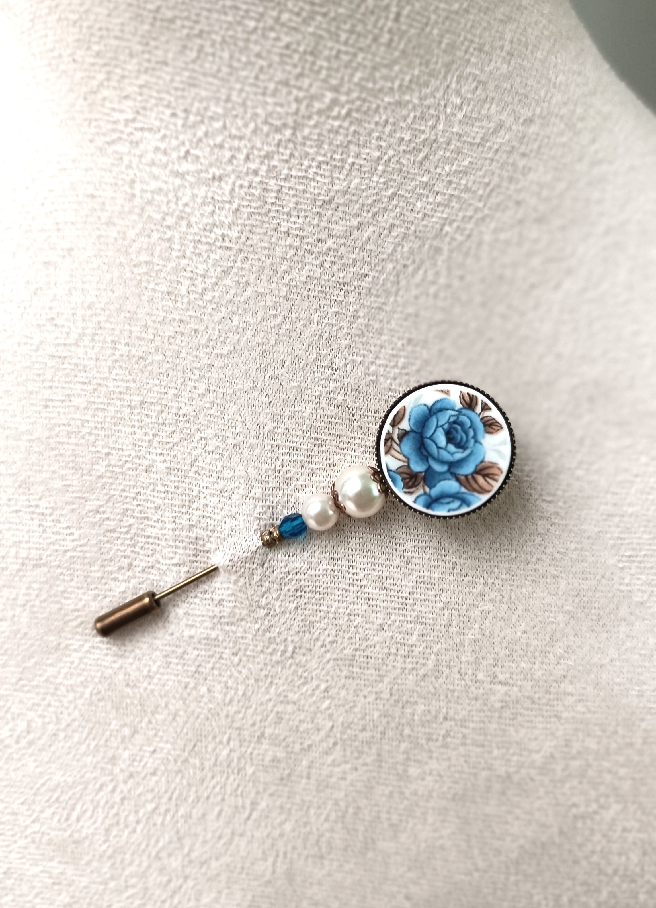 Broche ou pique à chapeau – Roses bleues & perles recyclées