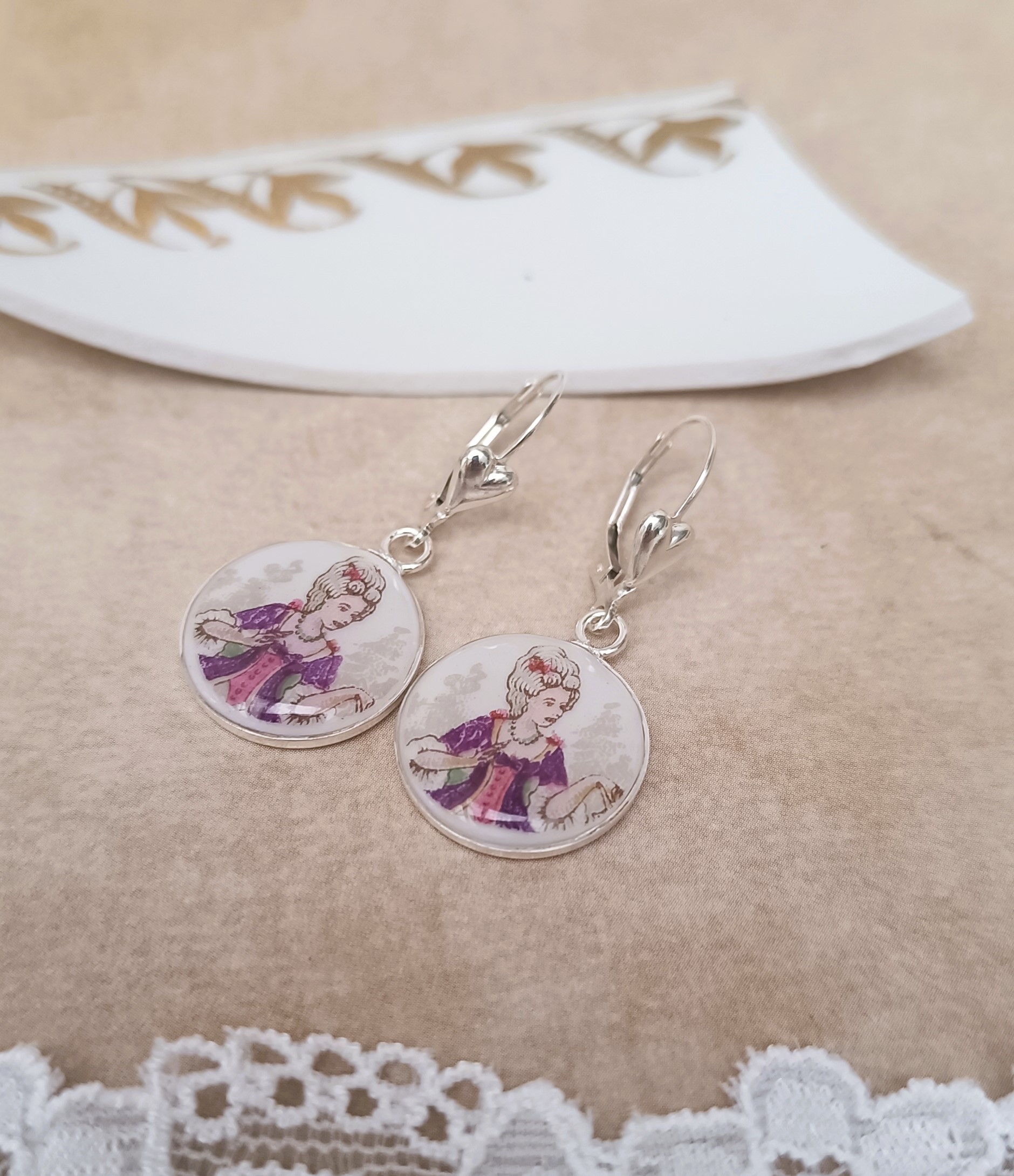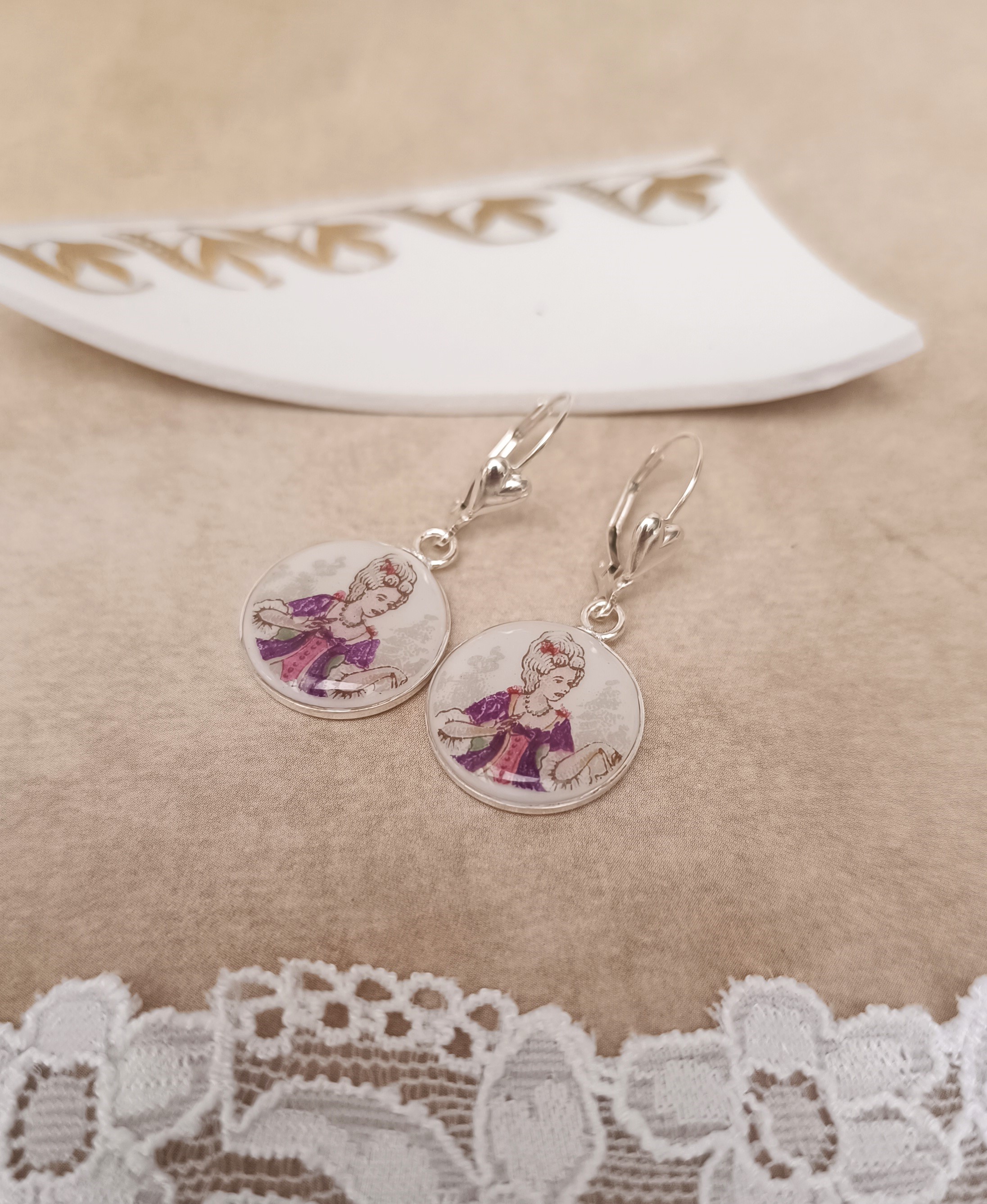 Ces boucles Carnet de bal sont nées de la transformation d’un fragment d’une tasse ancienne en porcelaine de Limoges, volontairement sauvée d’un destin d’oubli.