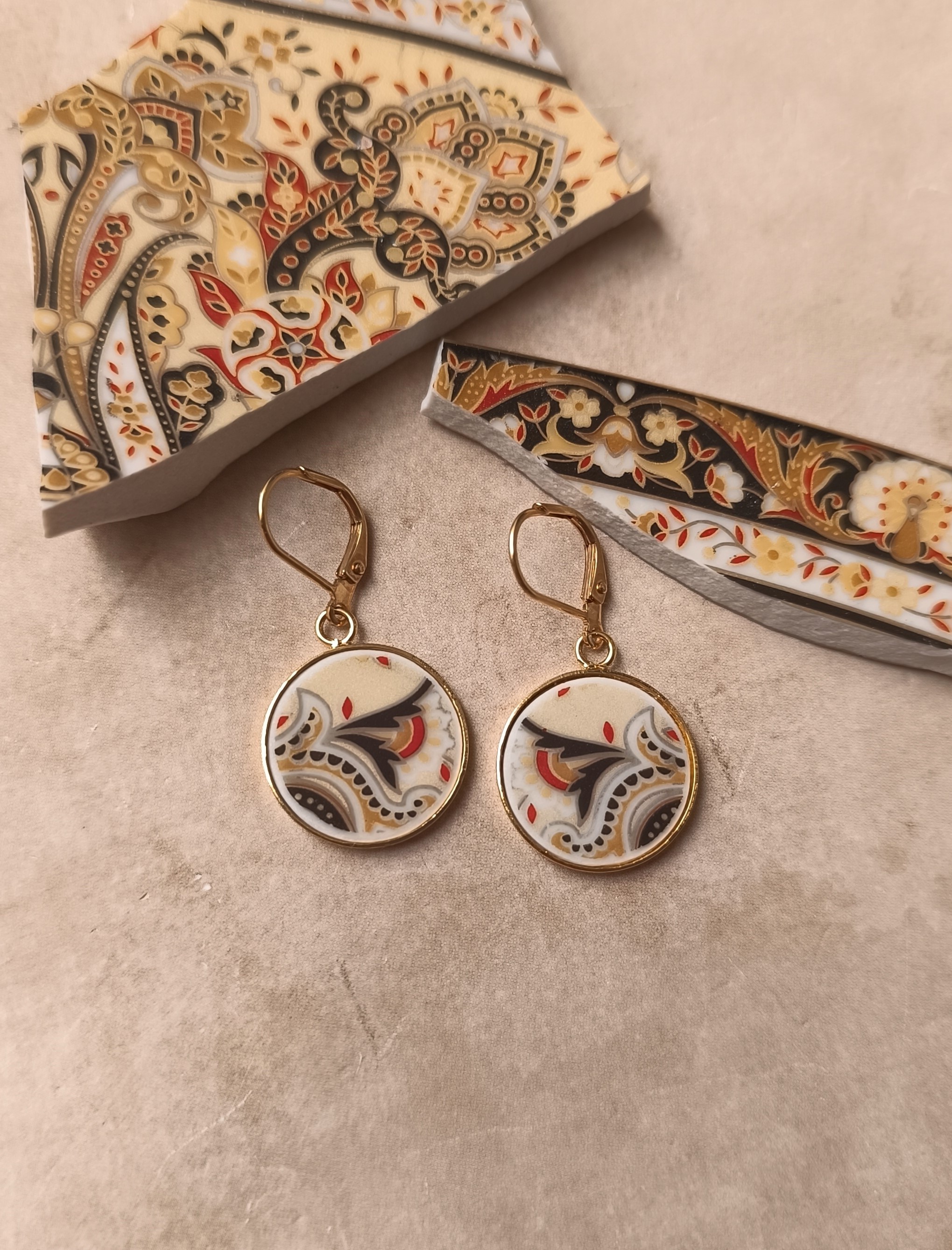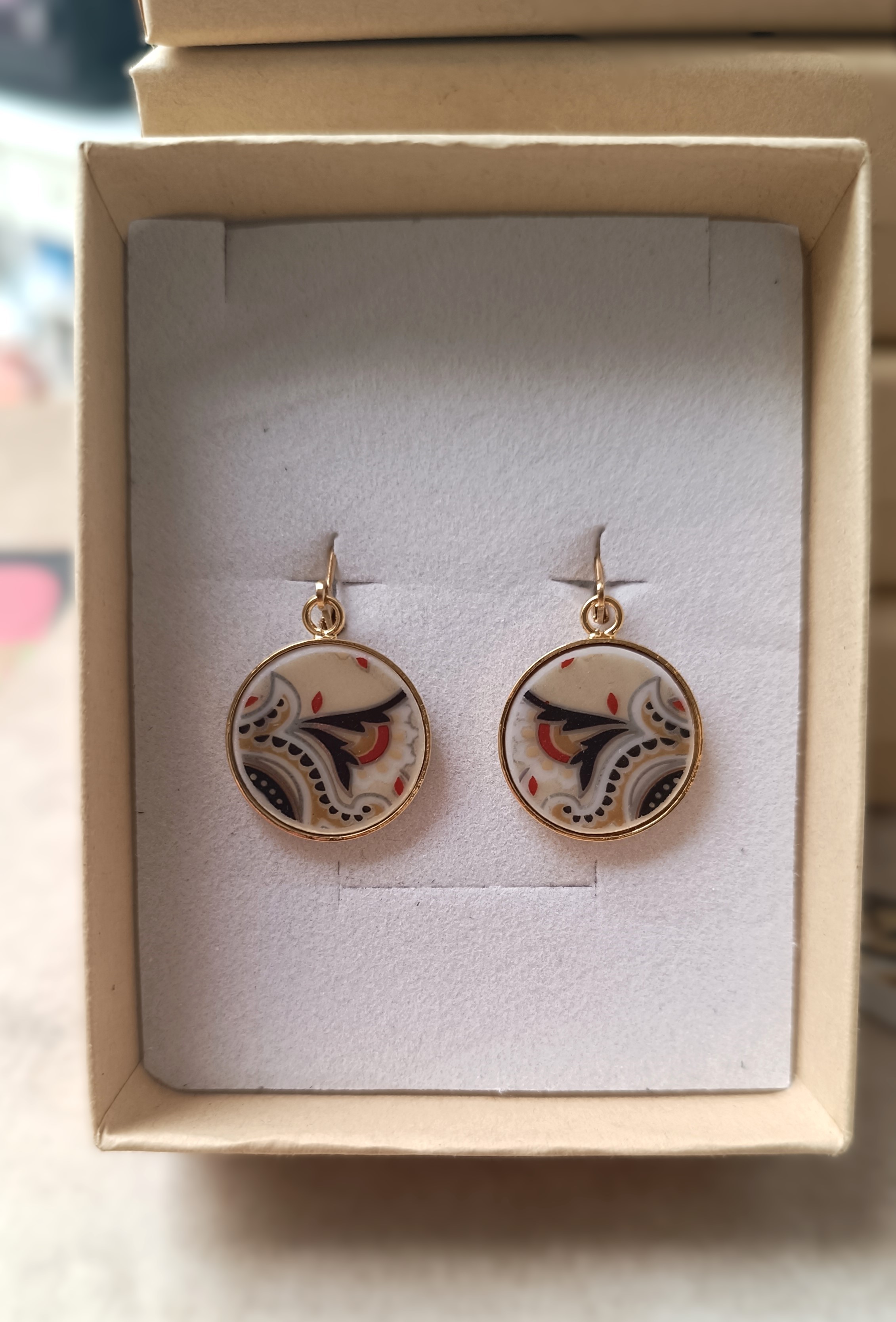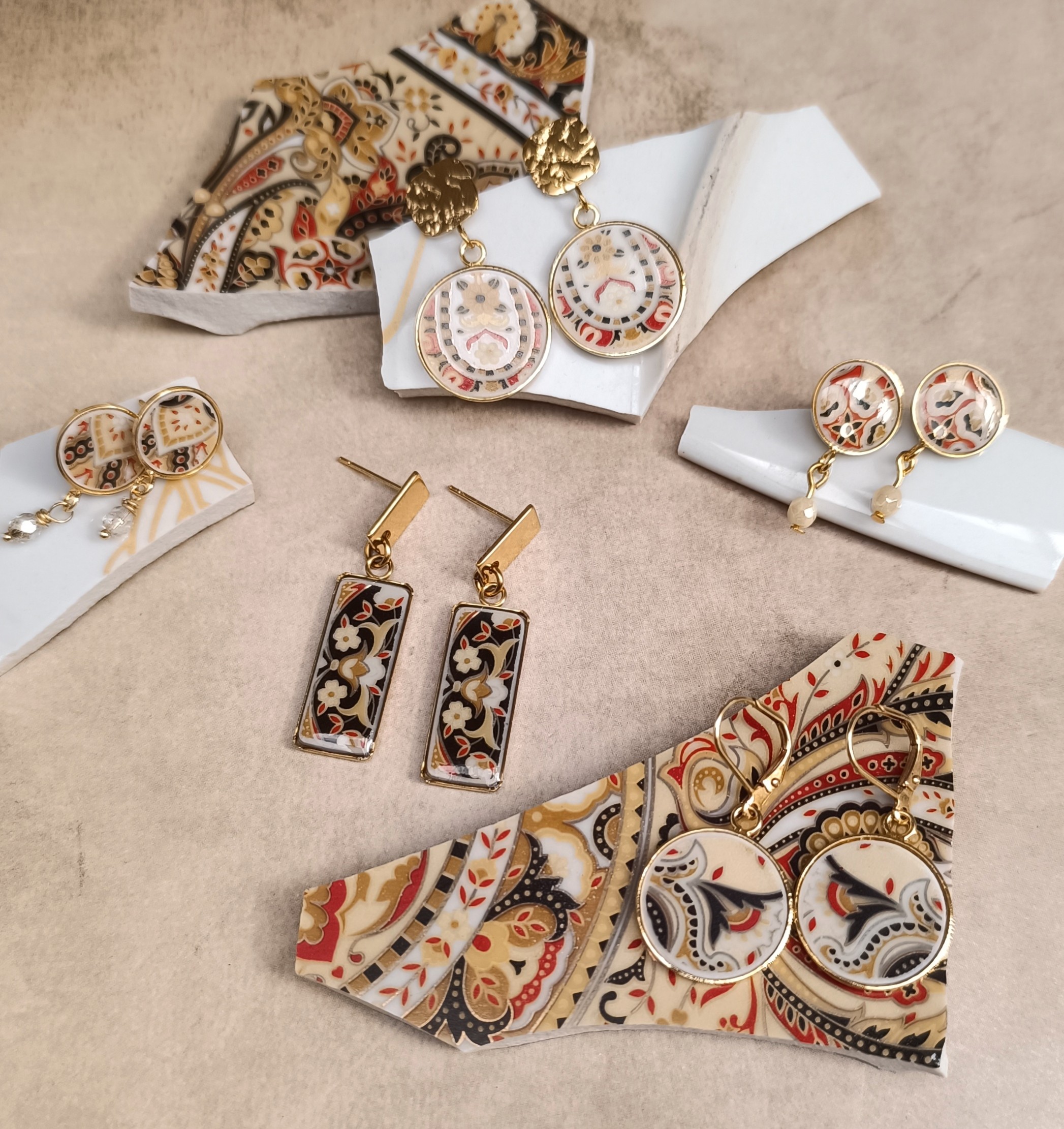 Cette série de boucles d’oreilles a été créée à partir d’une assiette cassée en grès fournie par ma cliente, ornée de motifs orientaux qu’elle souhaitait voir transformés en bijoux. Chaque paire est réalisée sur mesure, façonnée avec soin dans mon atelier à Calais, mettant en valeur le décor original tout en respectant l’authenticité de la matière.