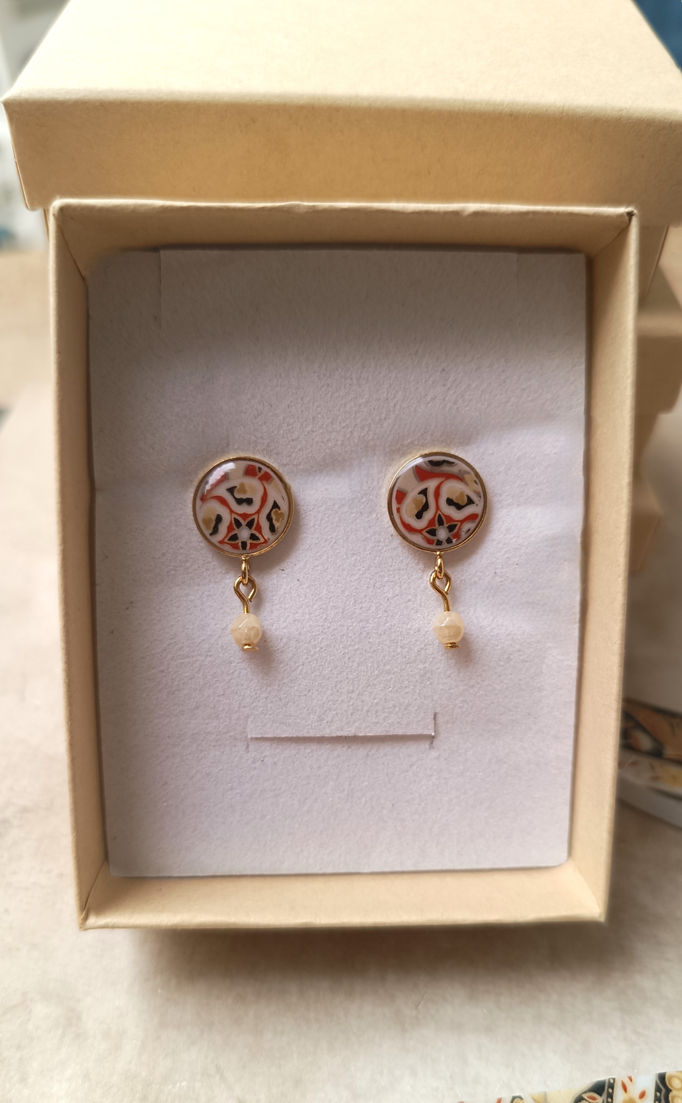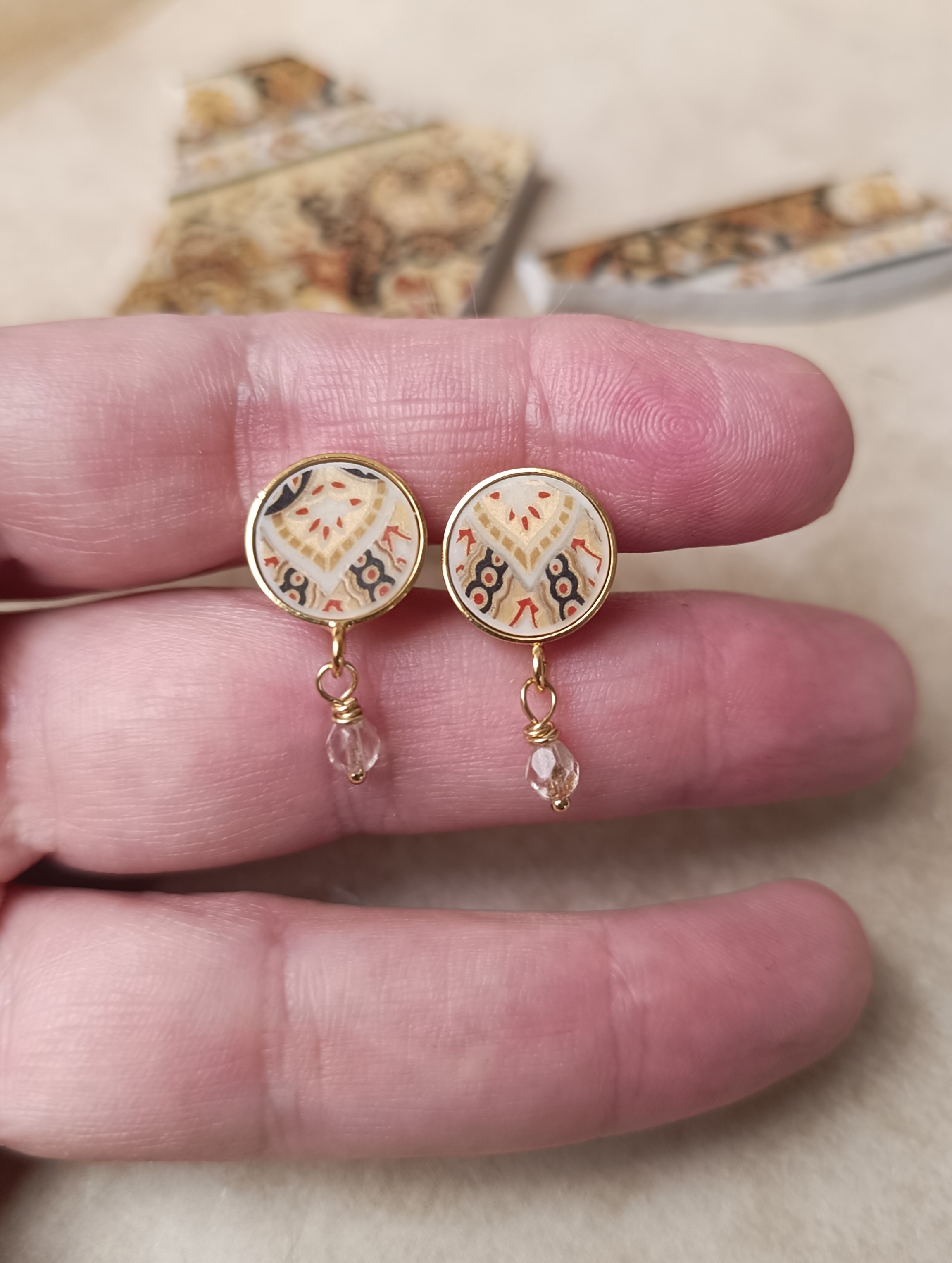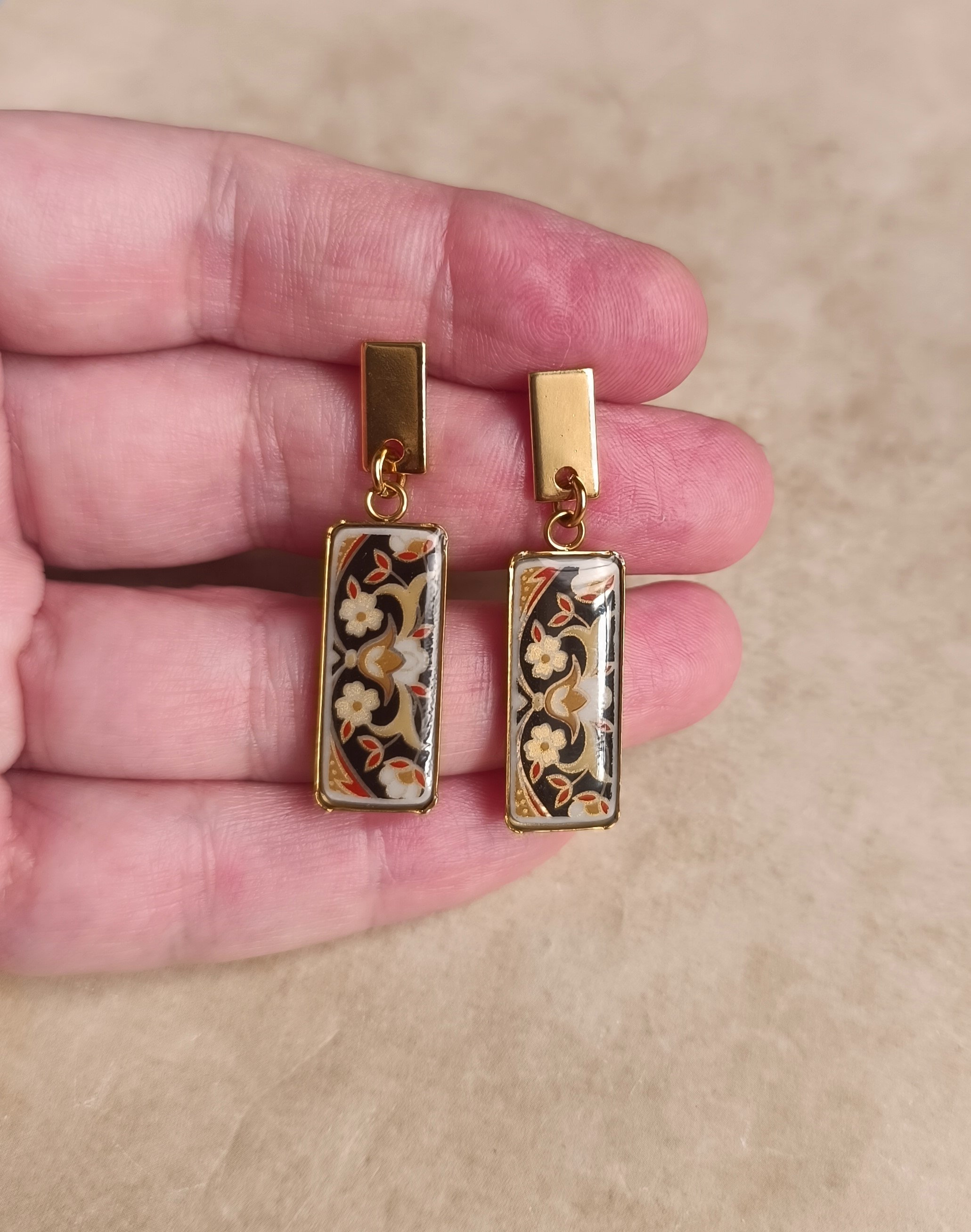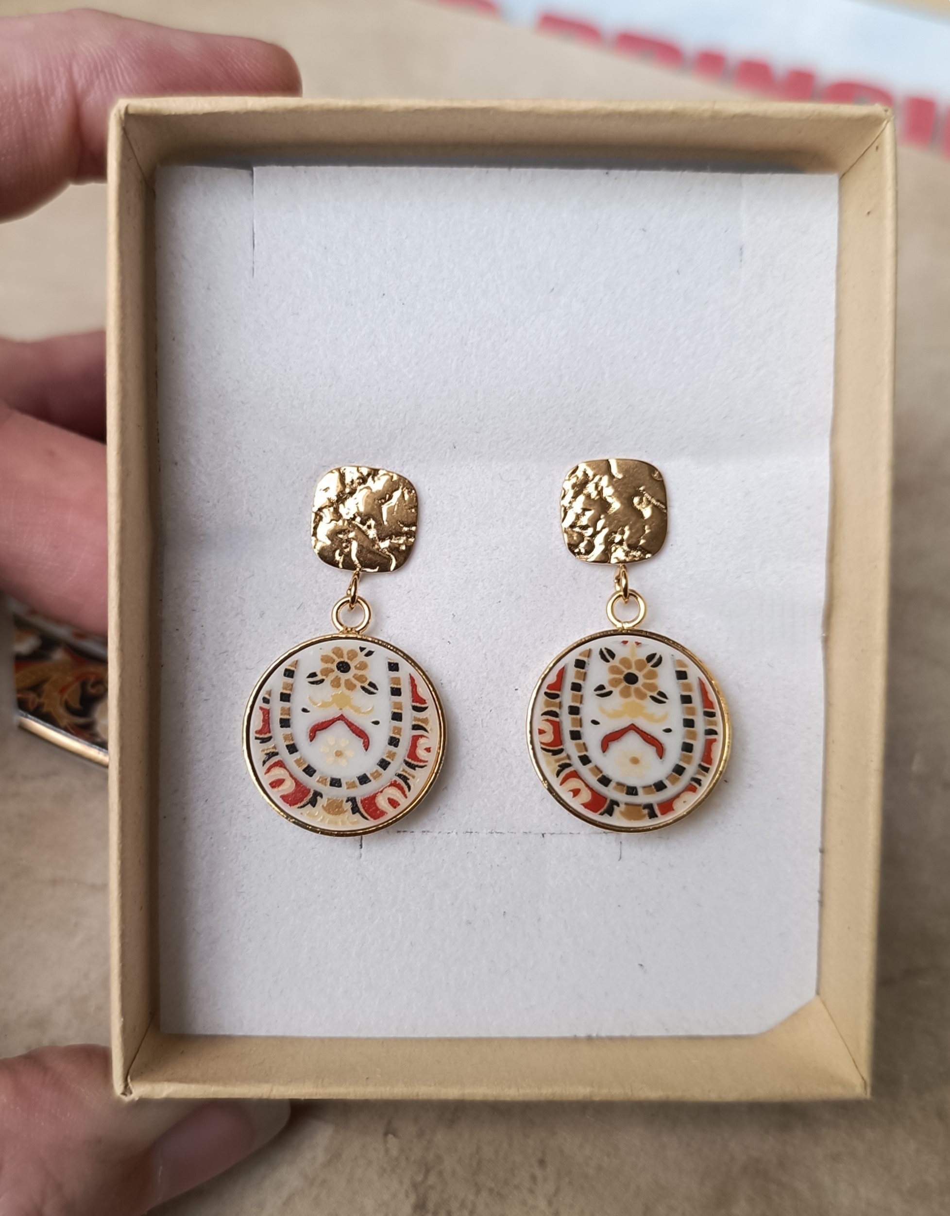 Cette série de boucles d’oreilles a été créée à partir d’une assiette cassée en grès fournie par ma cliente, ornée de motifs orientaux qu’elle souhaitait voir transformés en bijoux. Chaque paire est réalisée sur mesure, façonnée avec soin dans mon atelier à Calais, mettant en valeur le décor original tout en respectant l’authenticité de la matière.