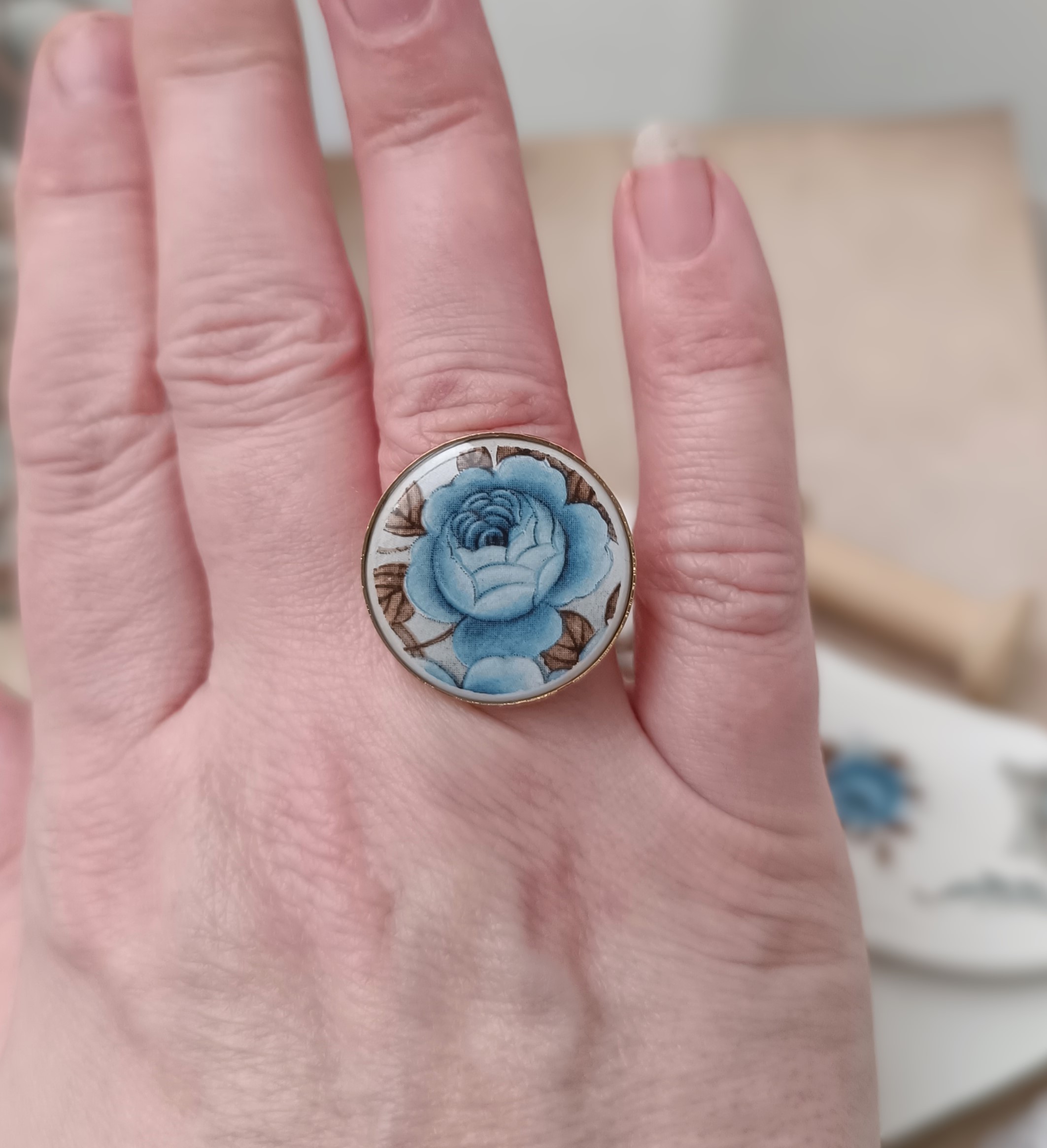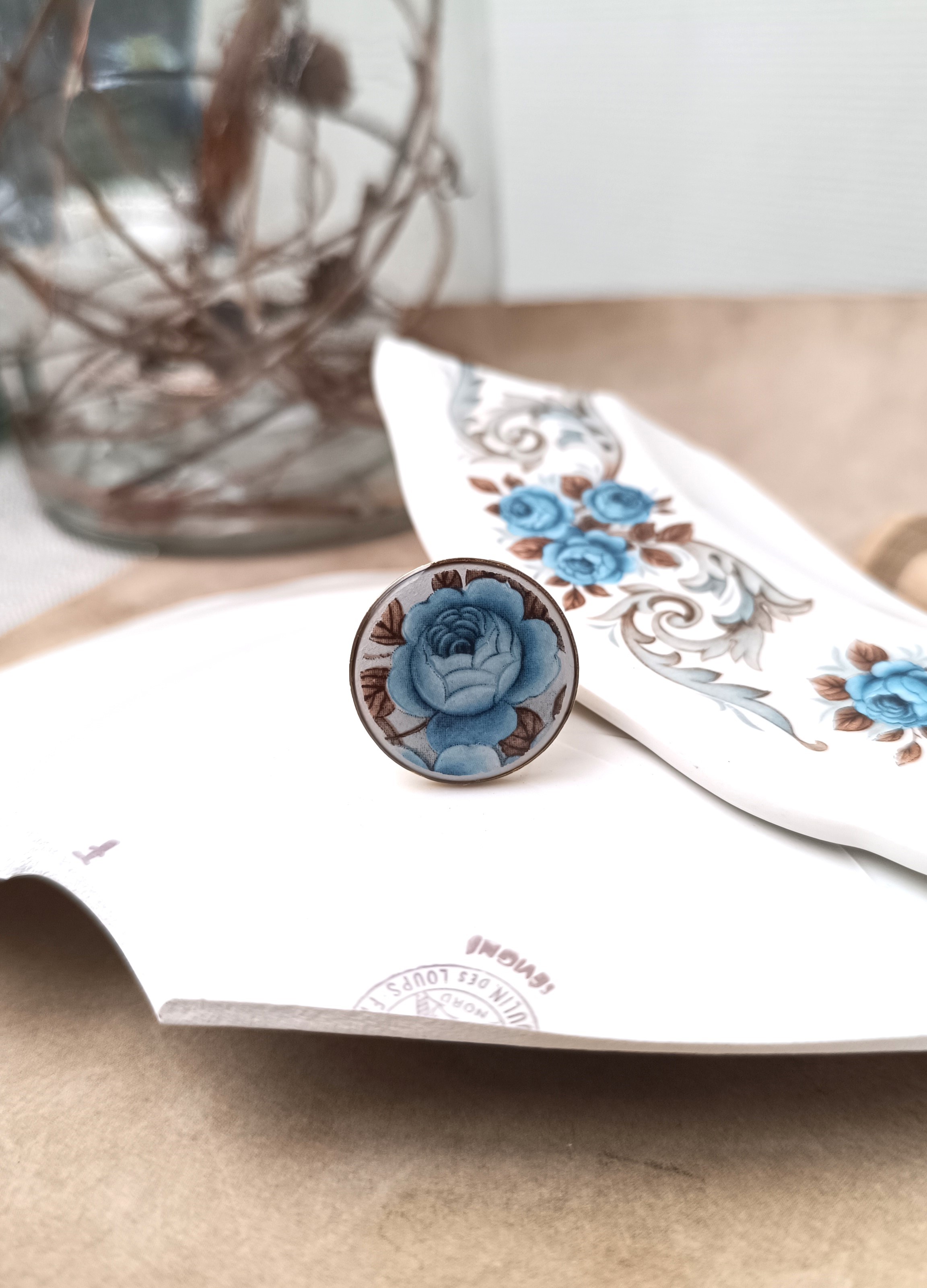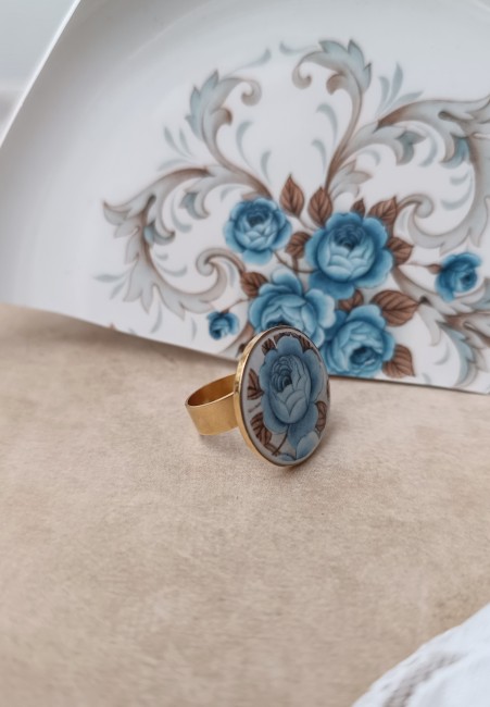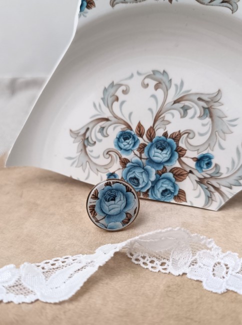 Cette bague Idylle est née de la transformation d’un fragment d’assiette ancienne en faïence Moulin des Loups. Le motif romantique de fleurs bleues est mis en valeur sur un grand support rond de 45 mm, offrant un bijou unique, pensé pour être porté seul ou comme pièce maîtresse d’une tenue élégante.