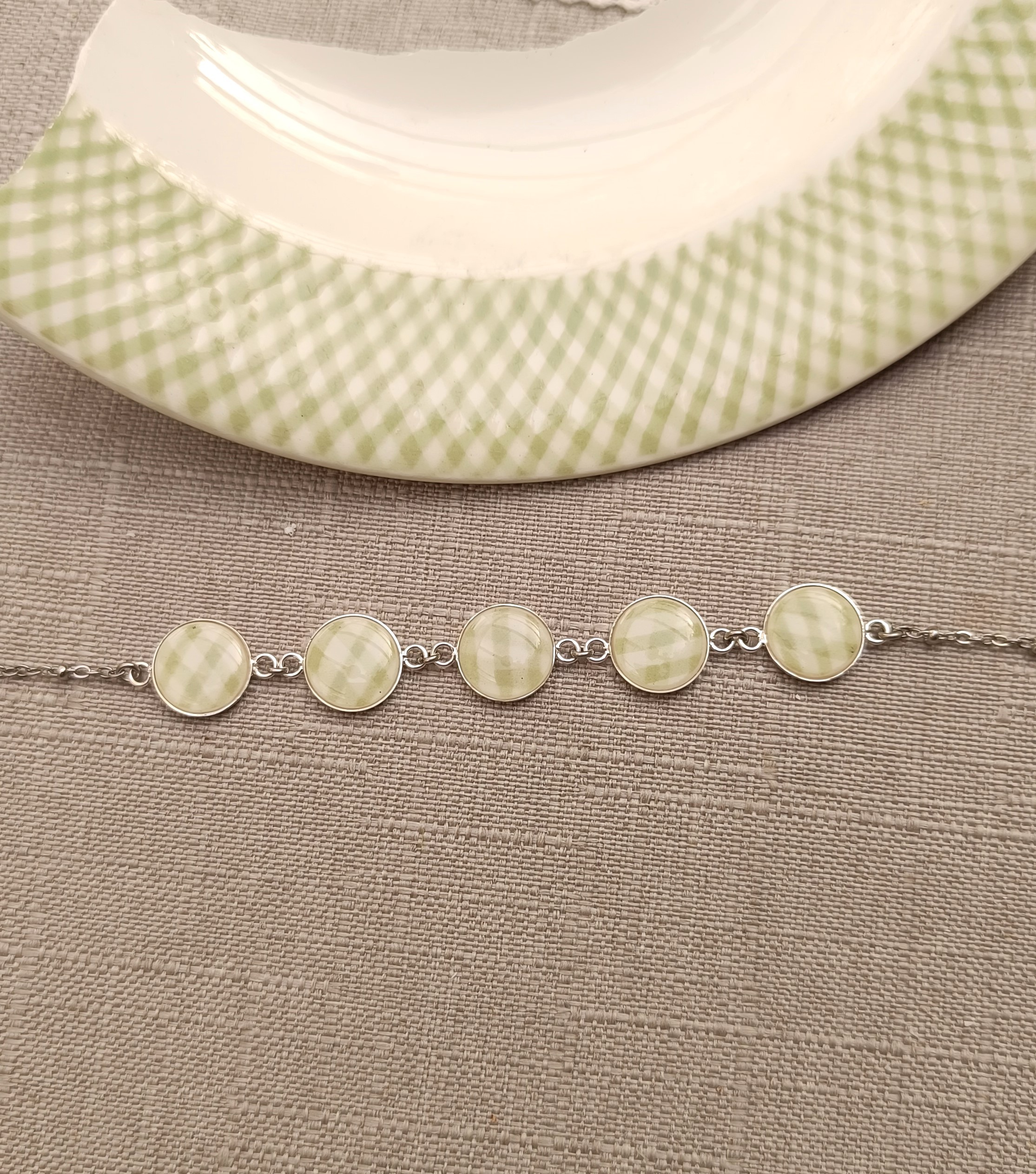 Dominique m’a confié une assiette ancienne faisant partie de son héritage familial. Cette pièce, marquée par le temps et les souvenirs, présentait un délicat motif vichy vert sauge et crème, témoin d’une histoire déjà bien vécue.