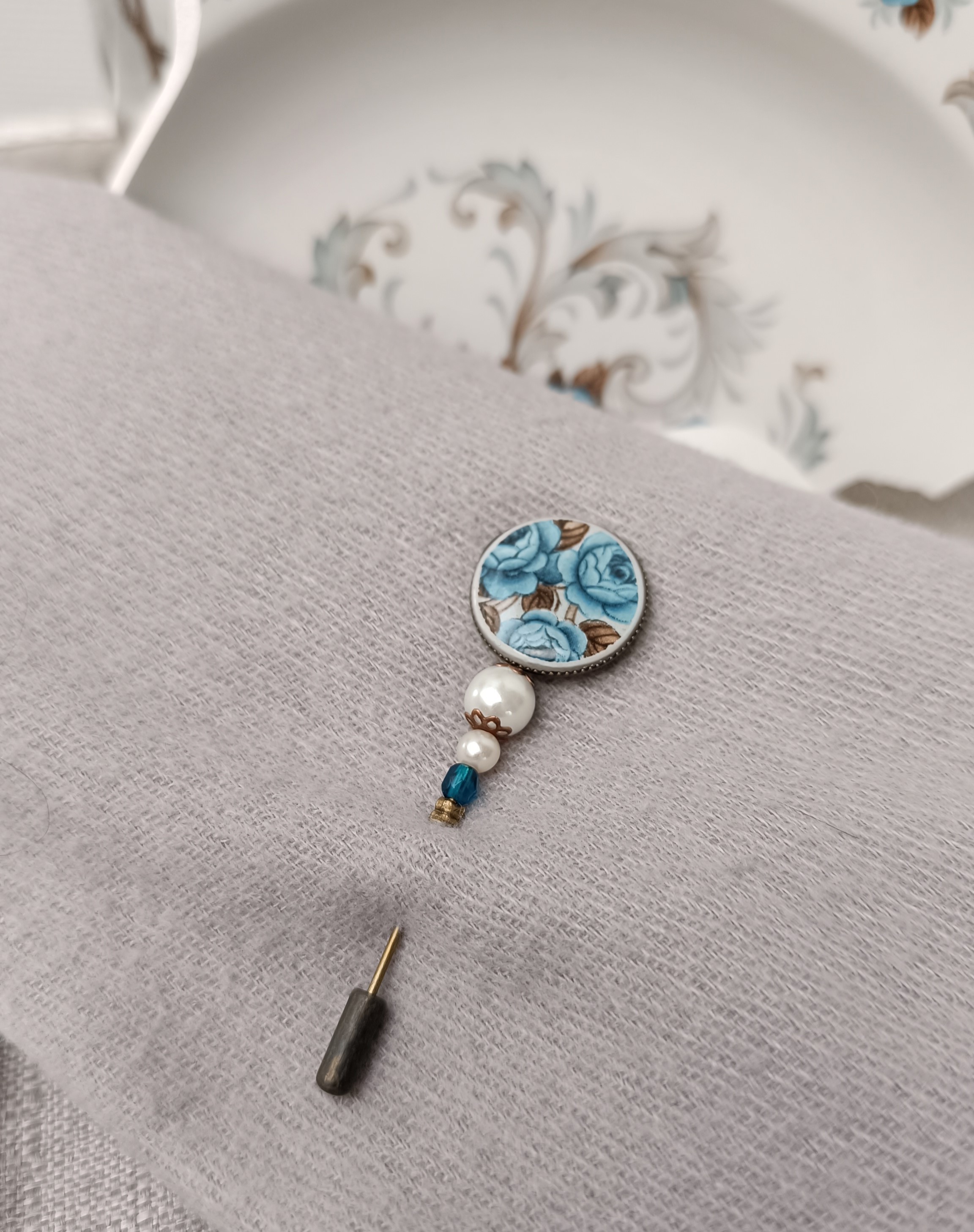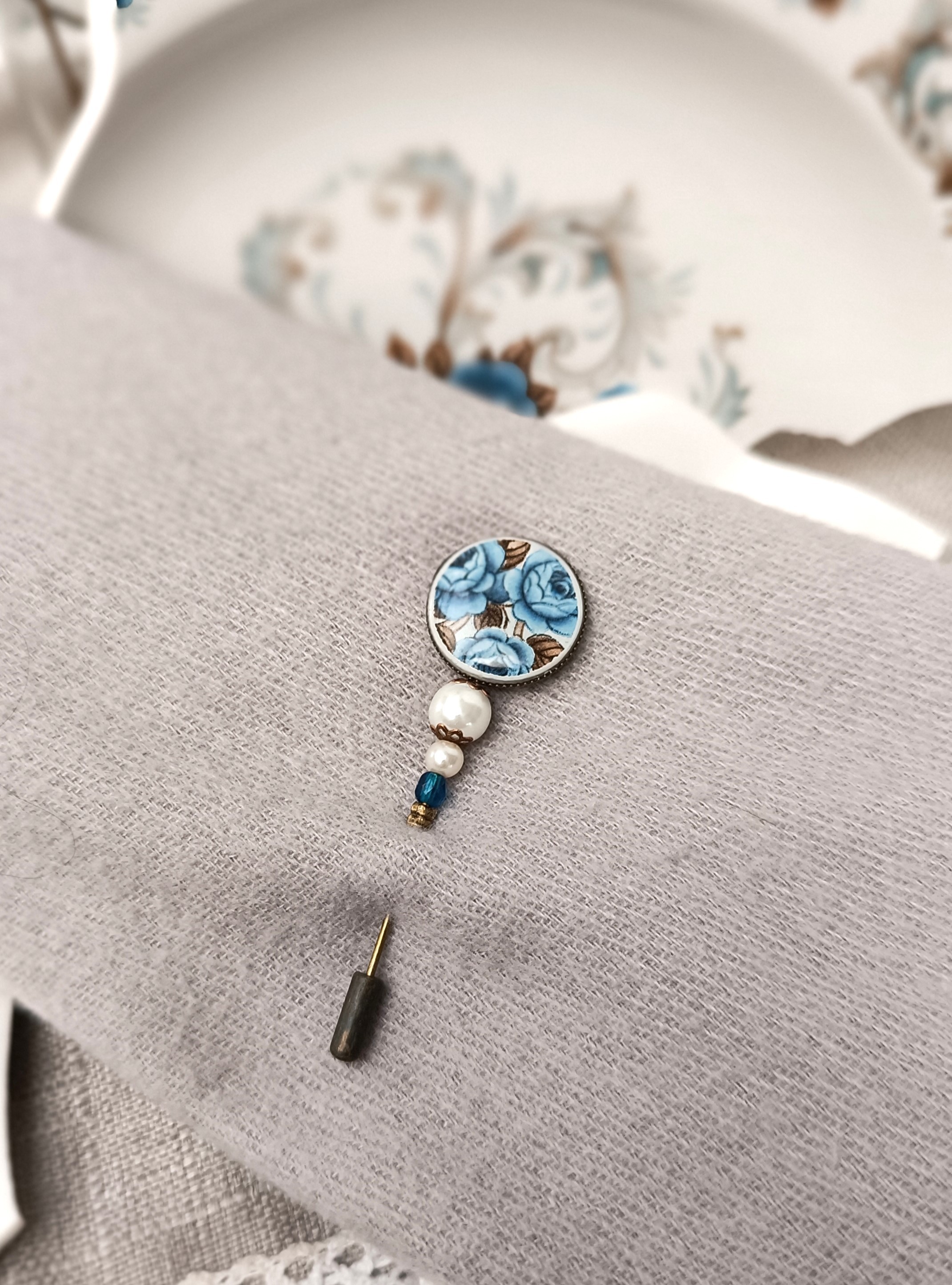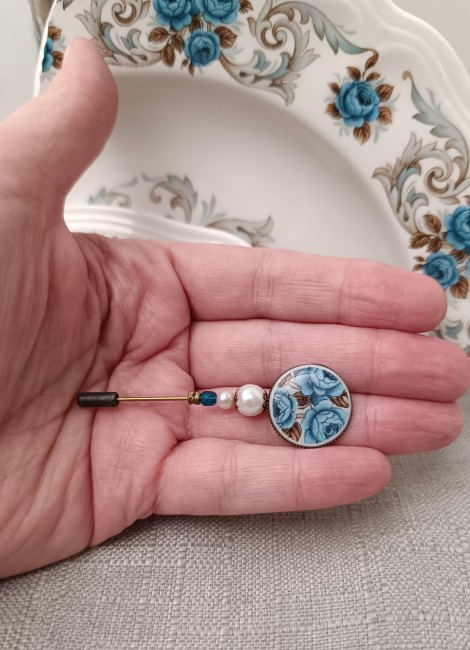 Cette fibule Idylle est née de la transformation d’une assiette ancienne en faïence Moulin des Loups, célèbre pour ses délicates roses bleues au charme intemporel.