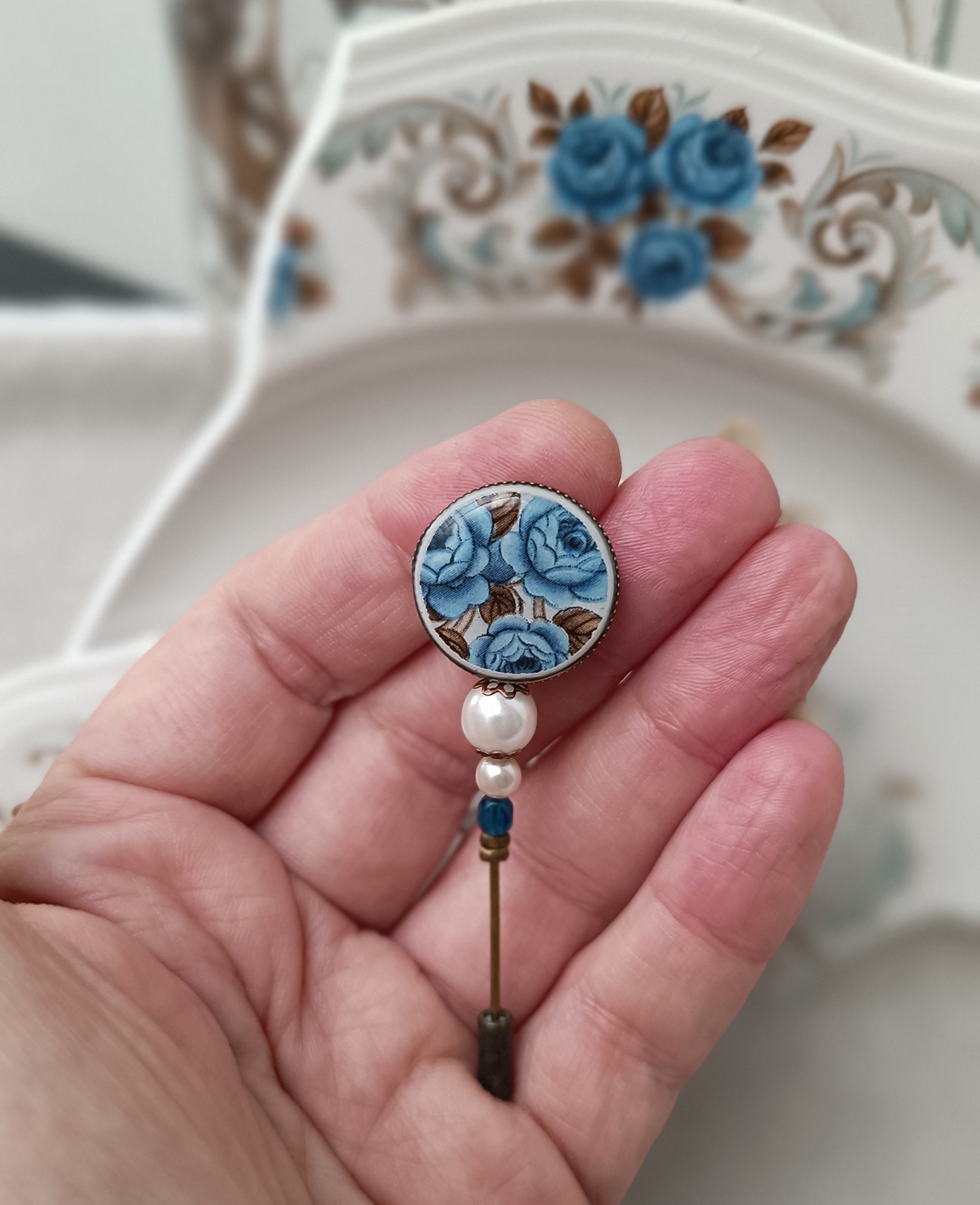 Broche ou pique à chapeau – Roses bleues & perles recyclées