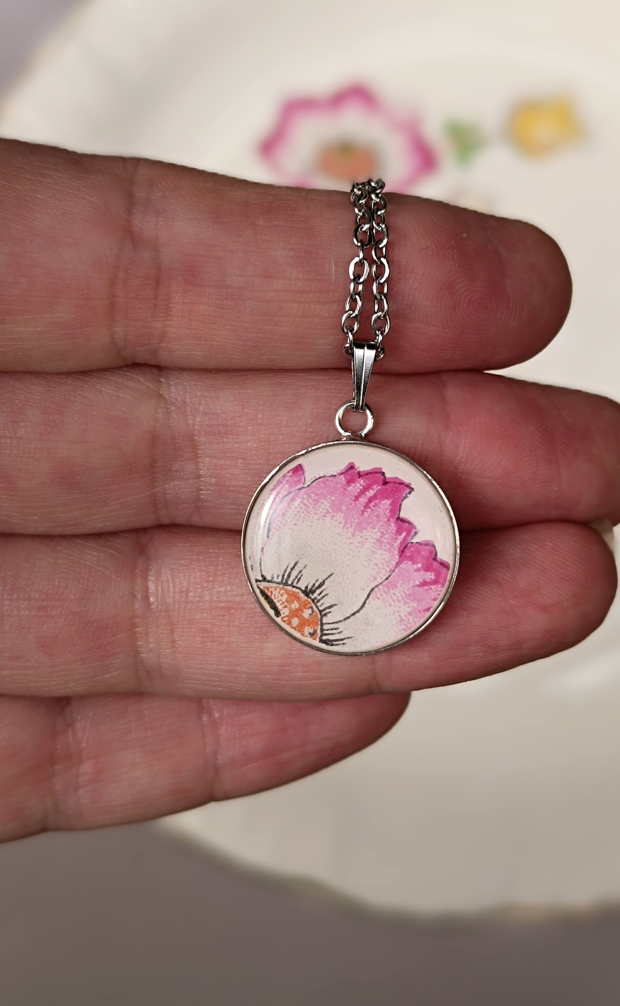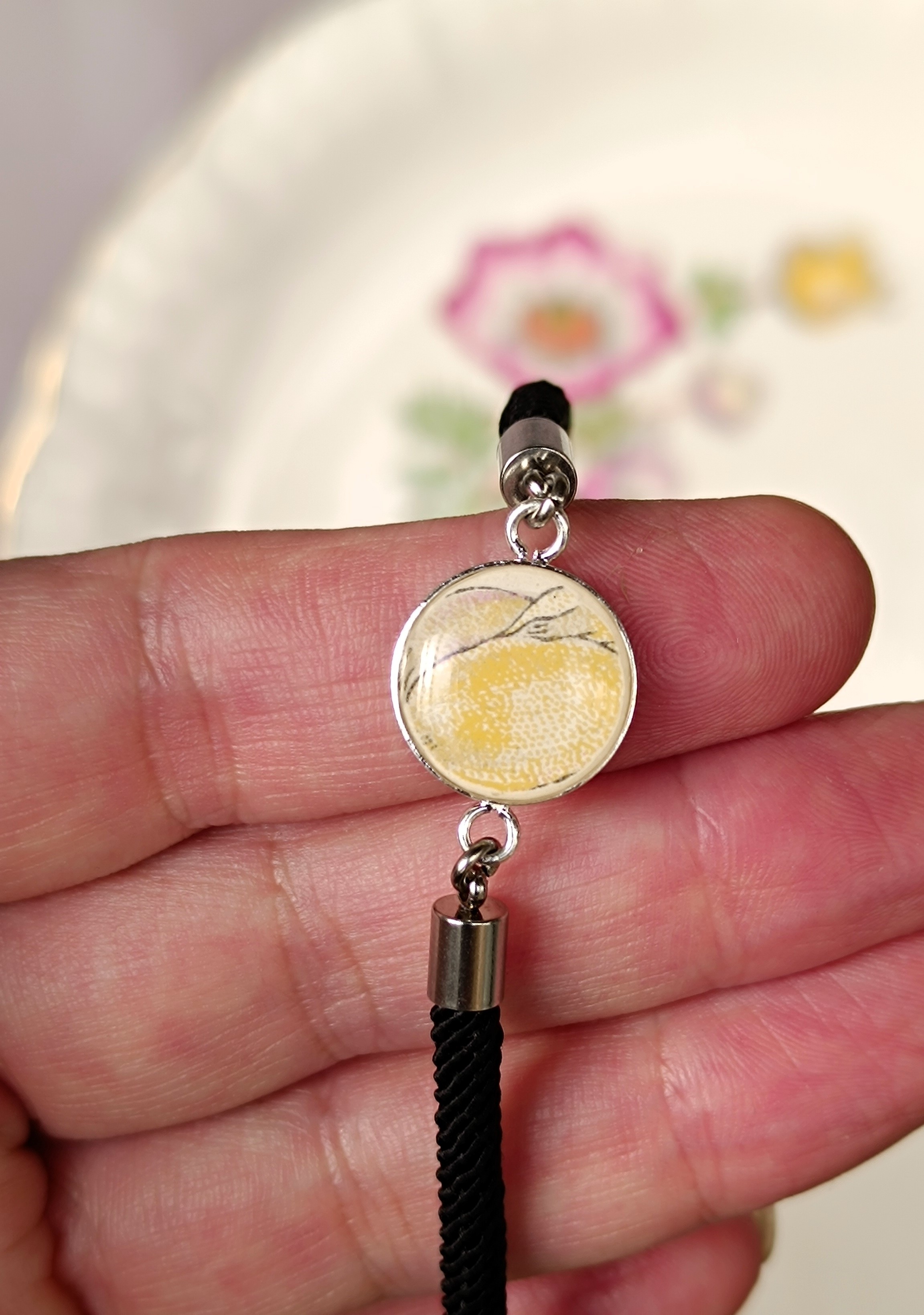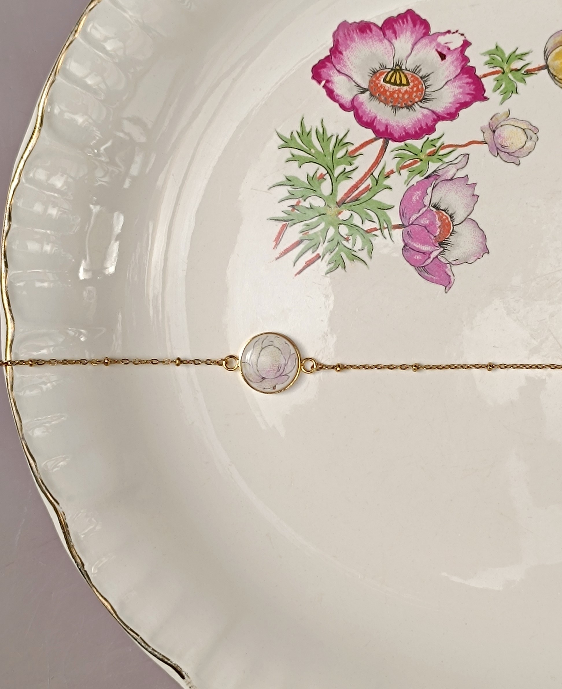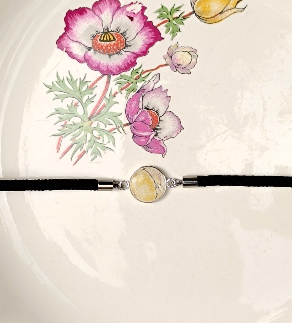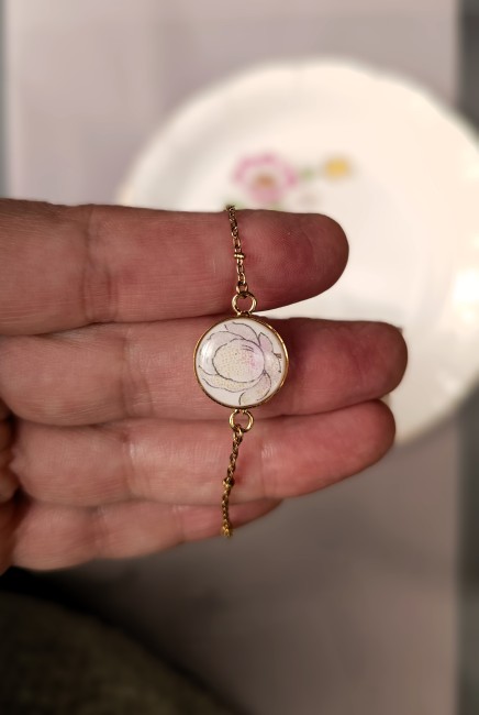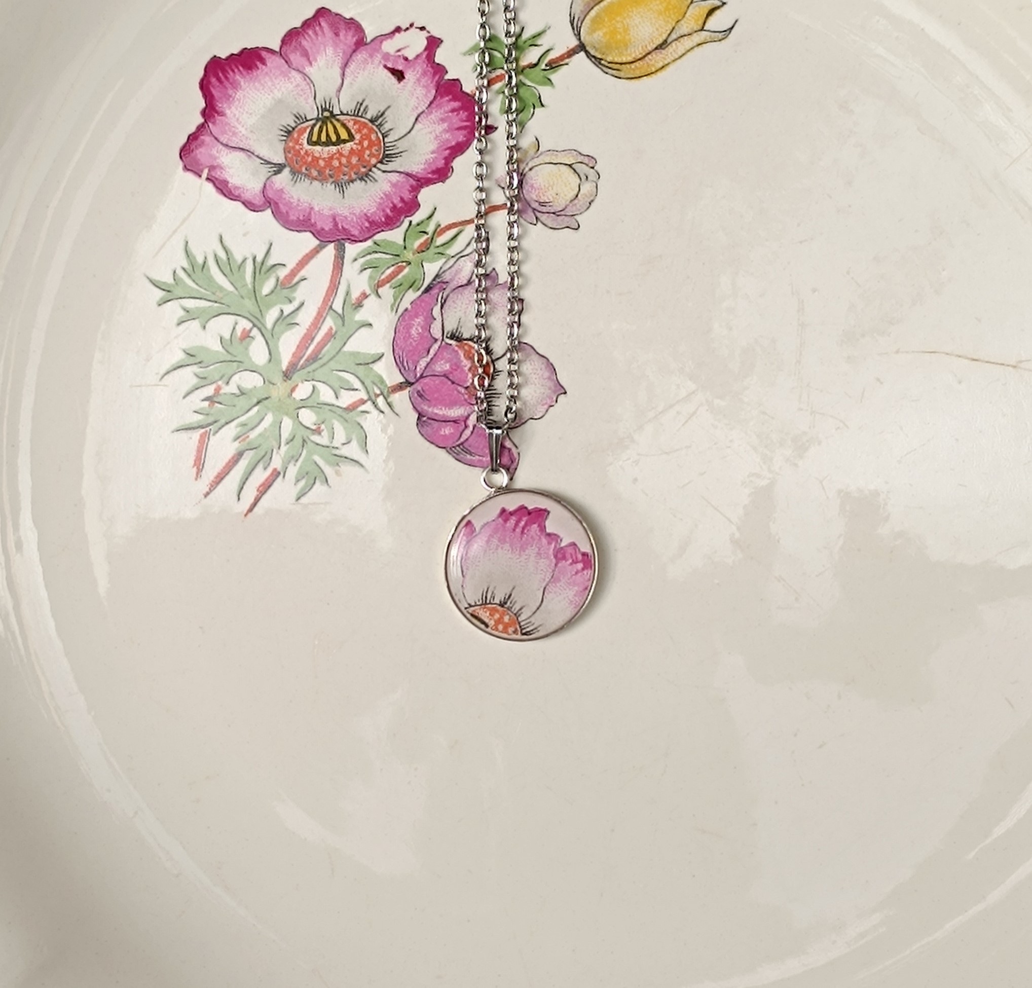 Cette création est née de la transformation d’une assiette familiale en faïence, confiée par Mélodie afin de préserver un objet chargé de souvenirs.