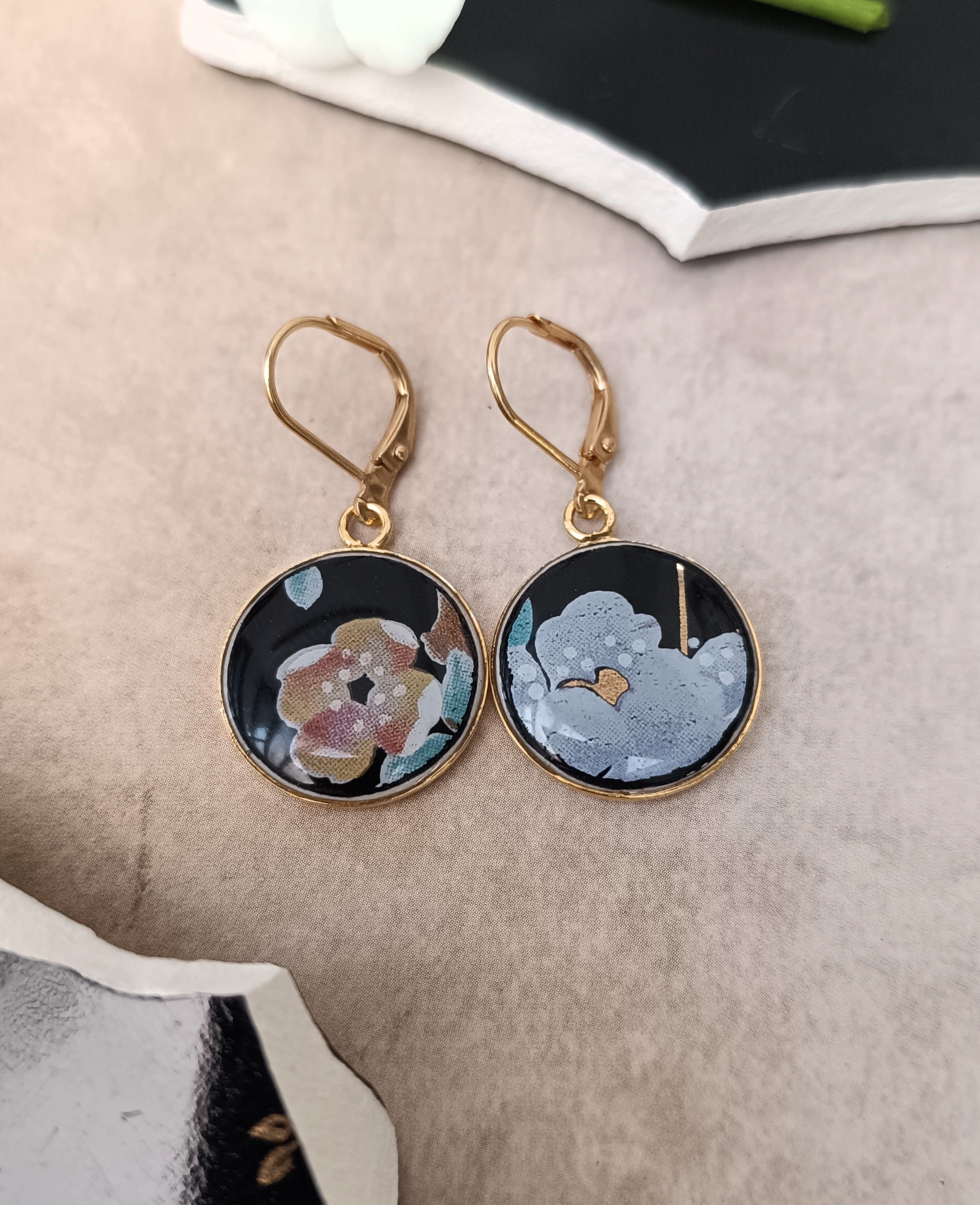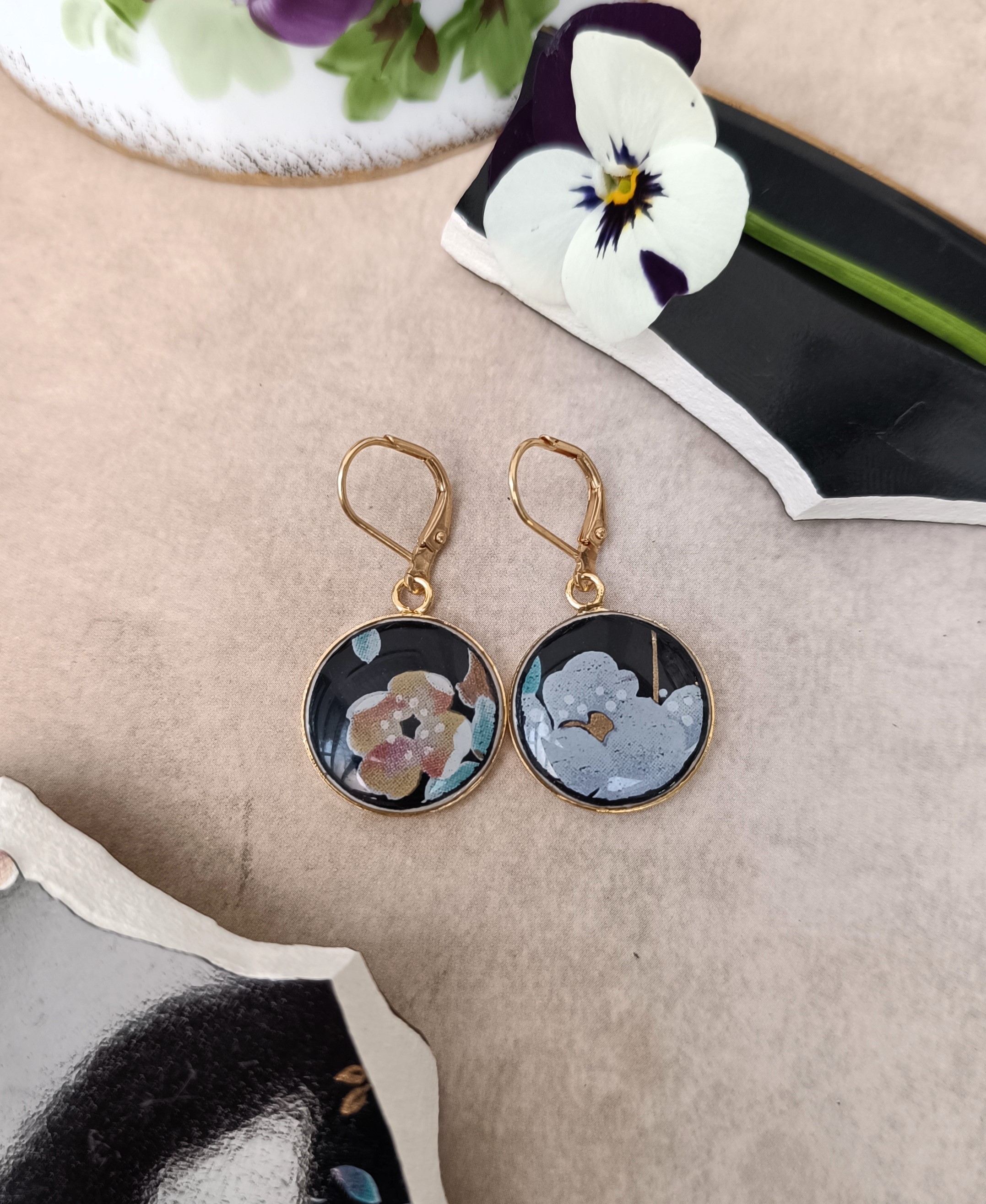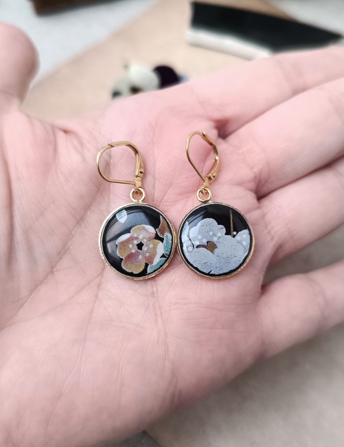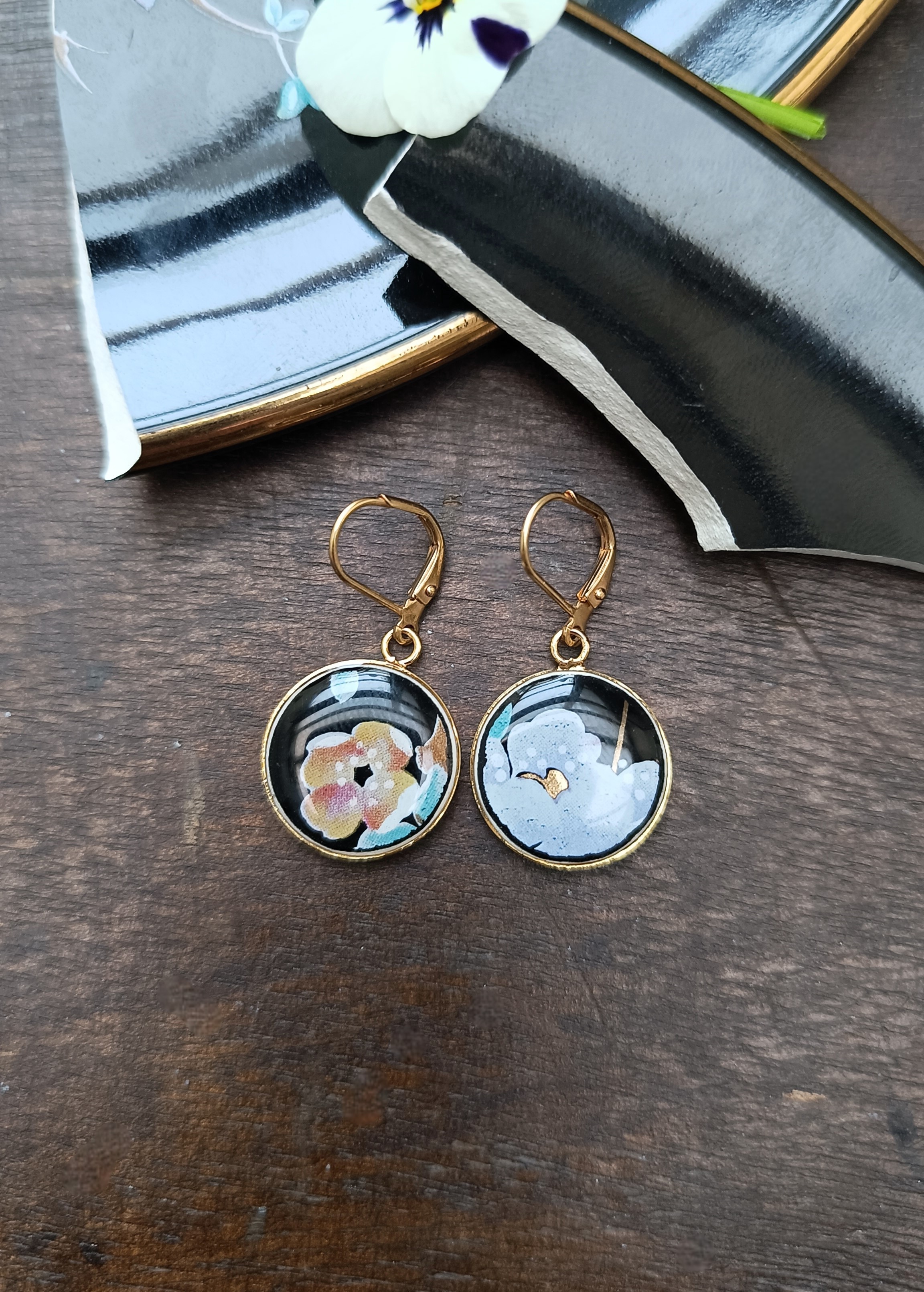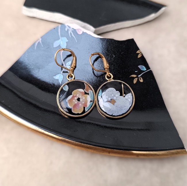 Ces boucles d’oreilles dormeuses appartiennent à la collection Nuit de Chine, réalisée à partir d’une assiette en faïence chinoise décorée à la main.