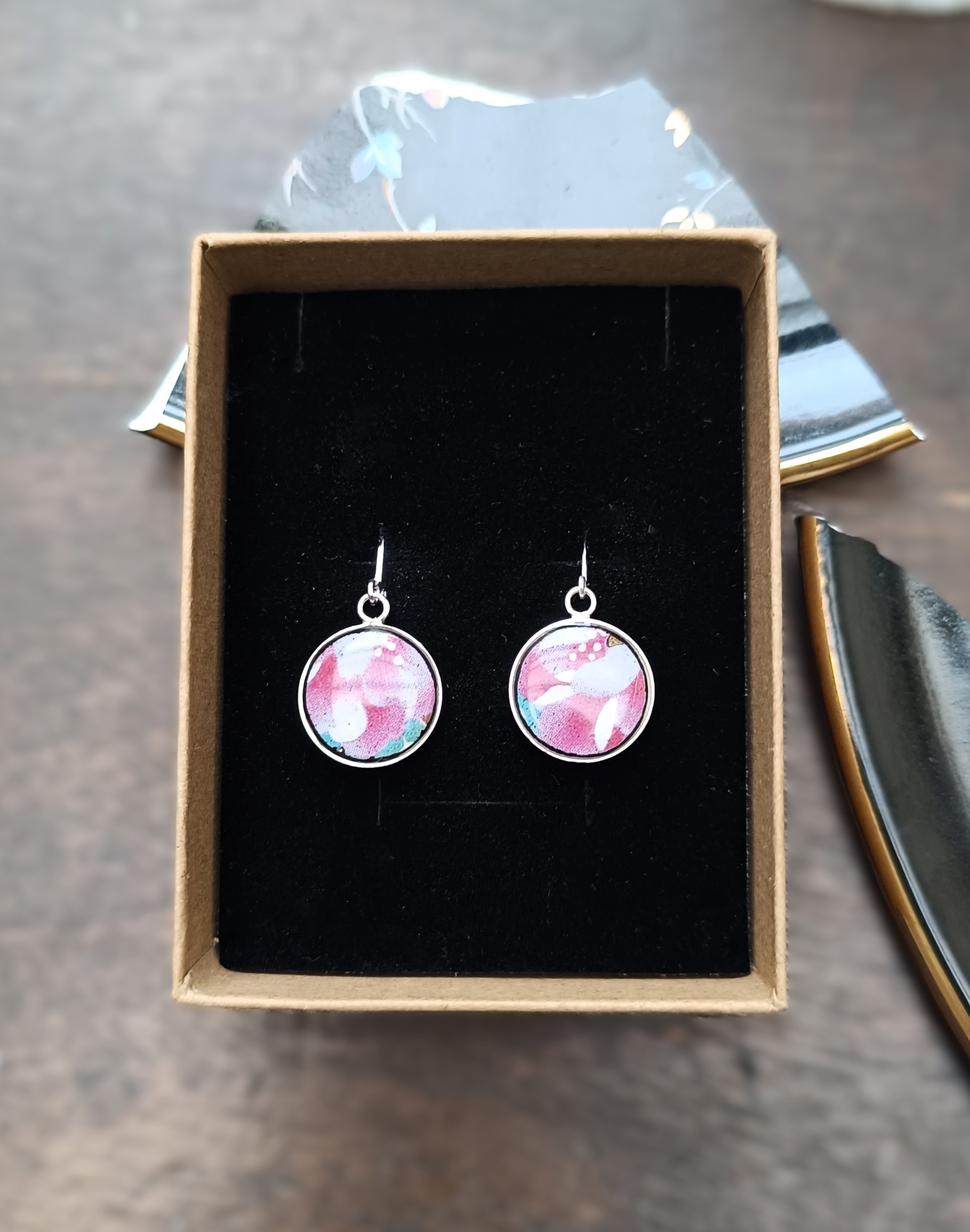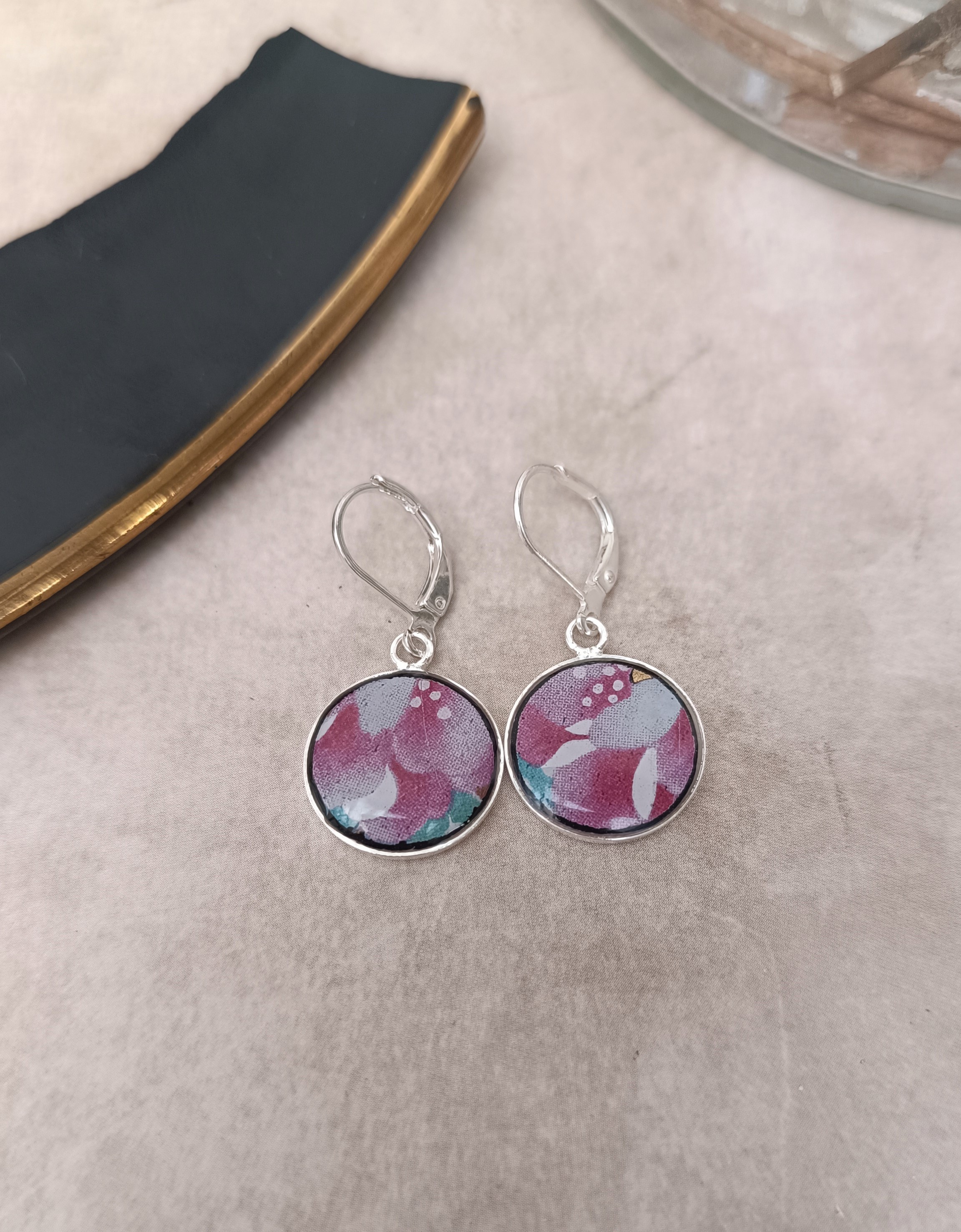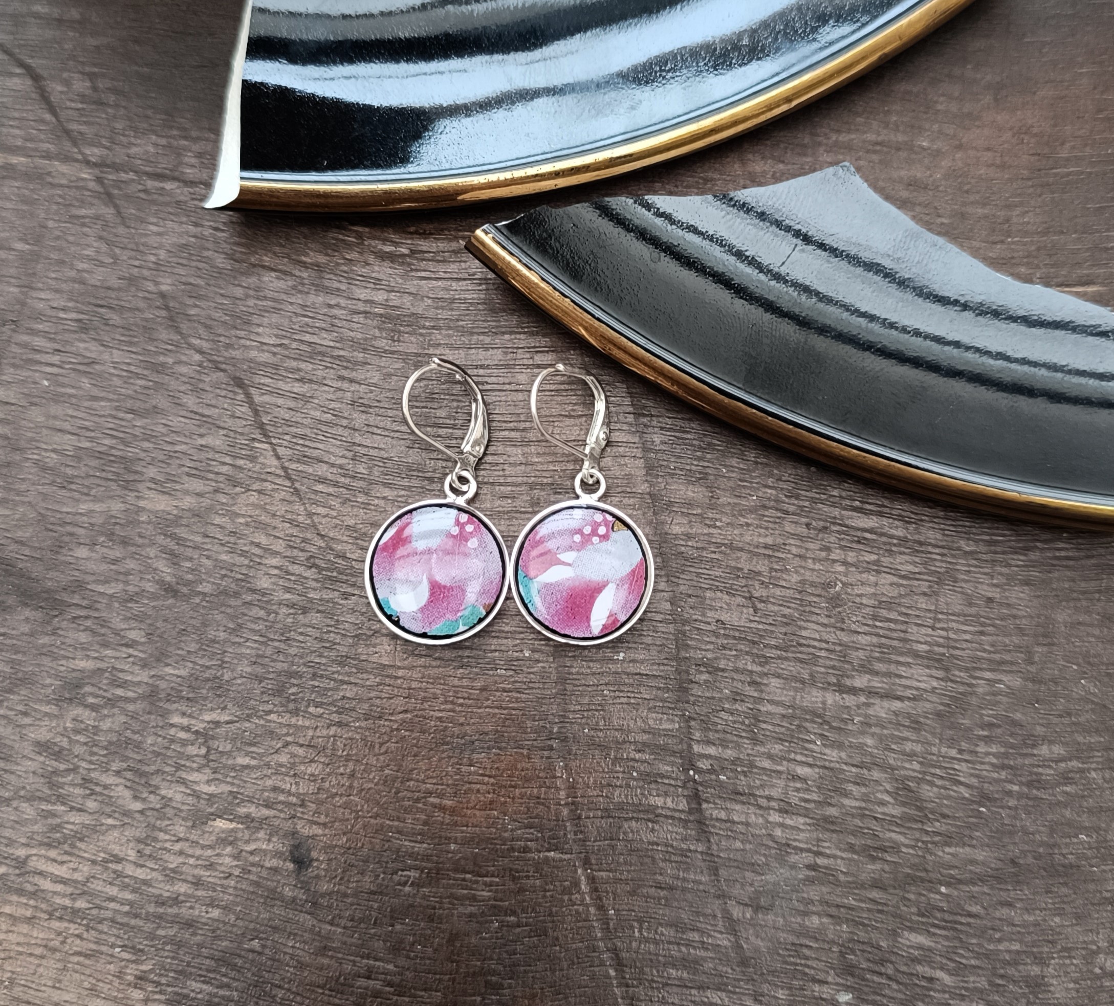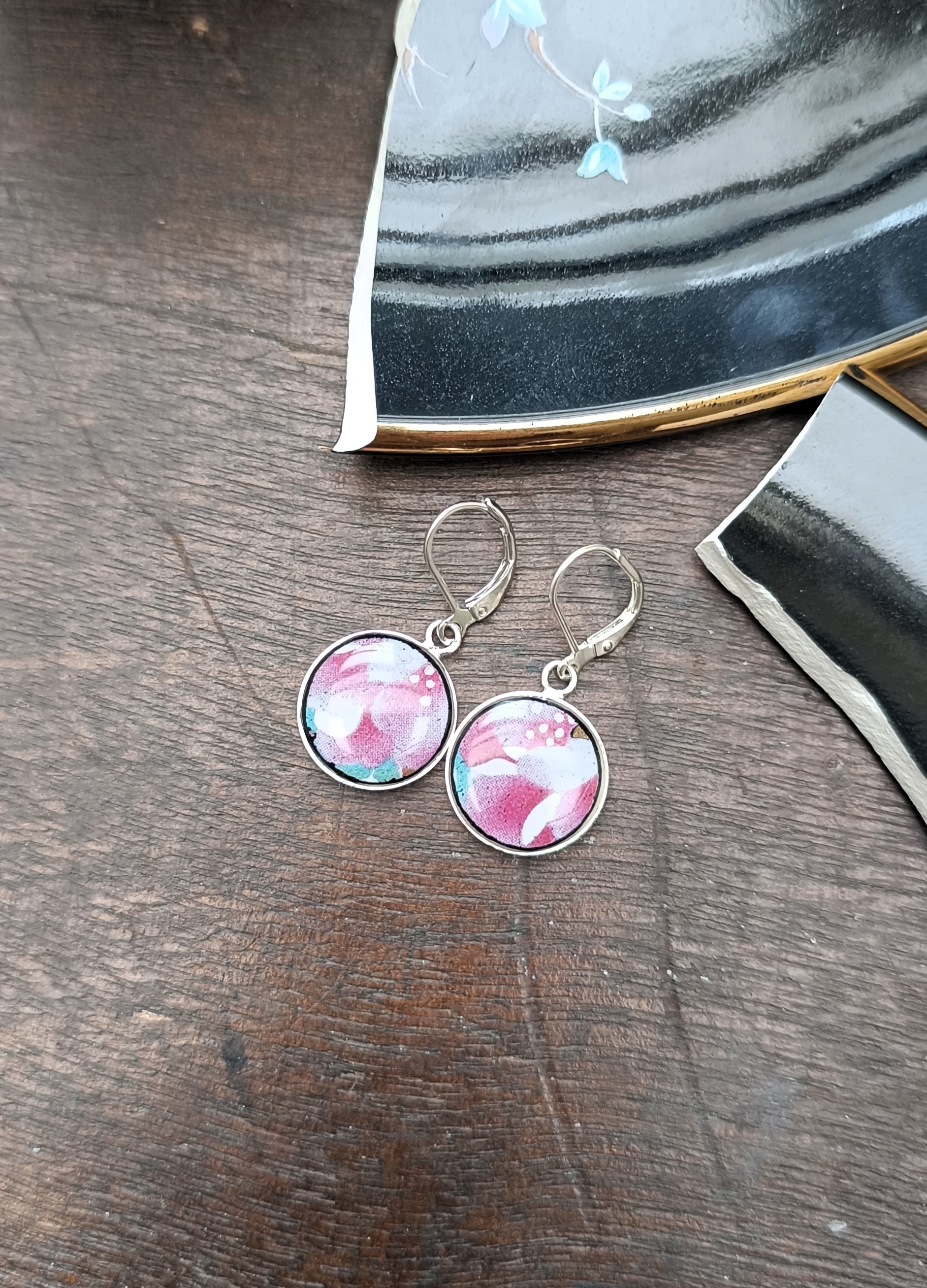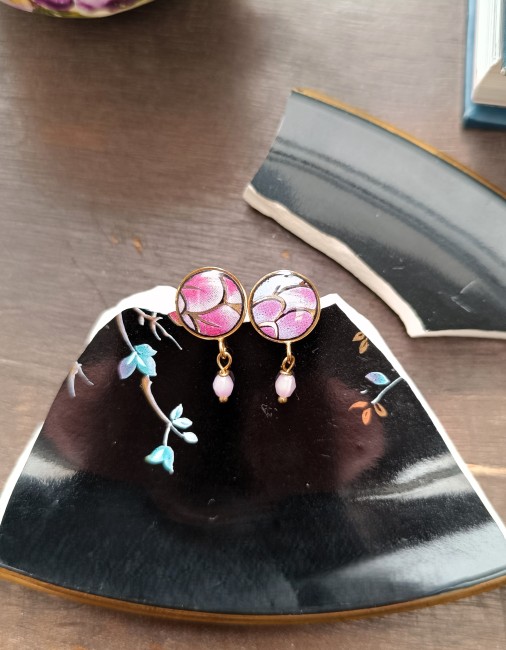 Ces boucles d’oreilles Dormeuses sont nées de la transformation d’une assiette en faïence chinoise laquée noire, aux motifs floraux peints à la main.