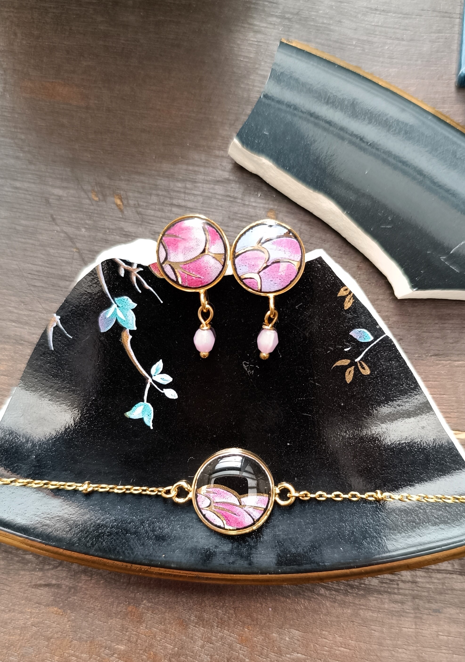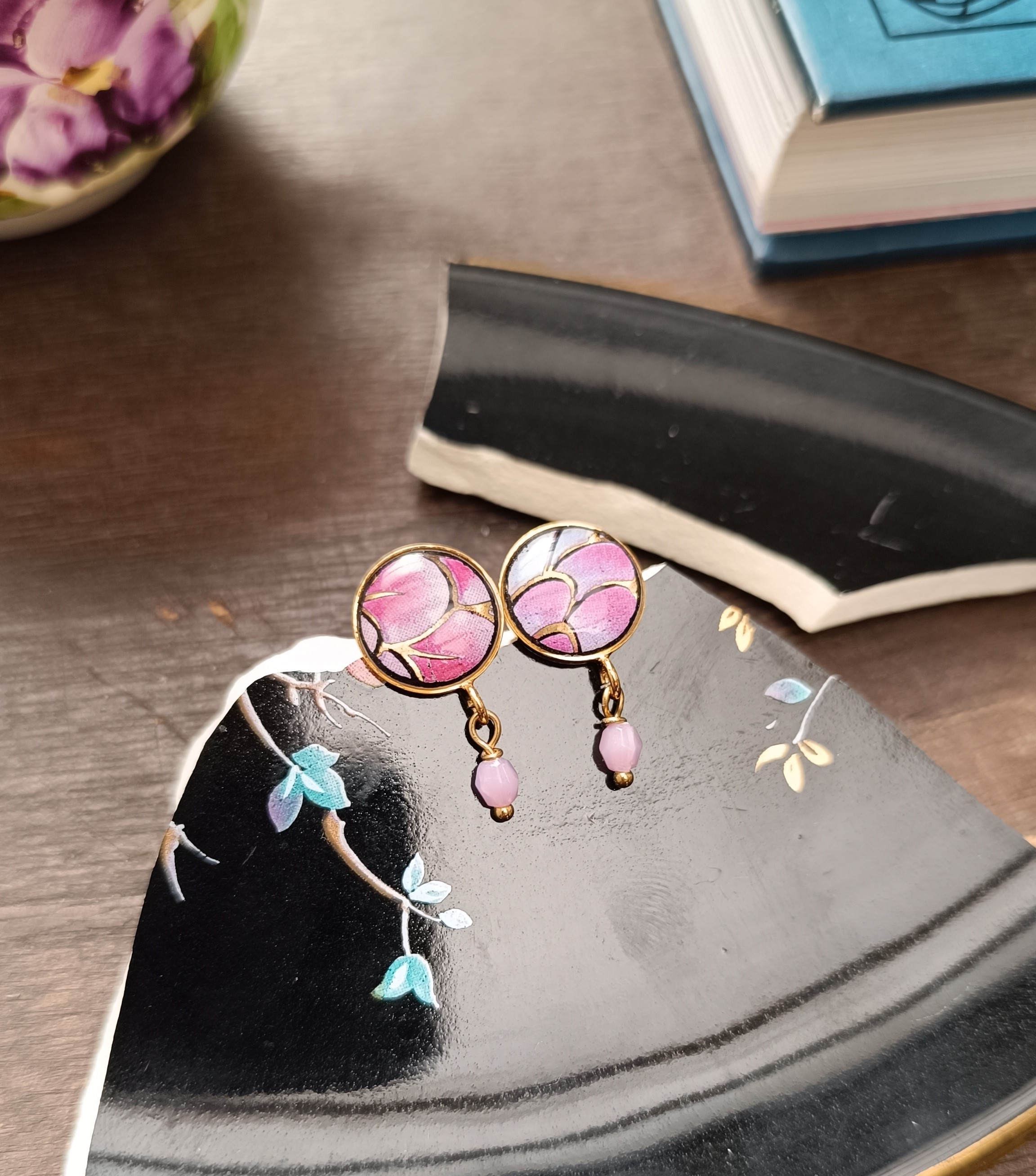Ces boucles d’oreilles puces font partie de la collection Nuit de Chine, réalisées à partir de fragments d’une assiette en faïence asiatique laquée noire, décorée à la main. Le motif représente de fines plumes aux teintes mauve et rose fuchsia, rehaussées de dorures et protégées par une finition résine brillante.