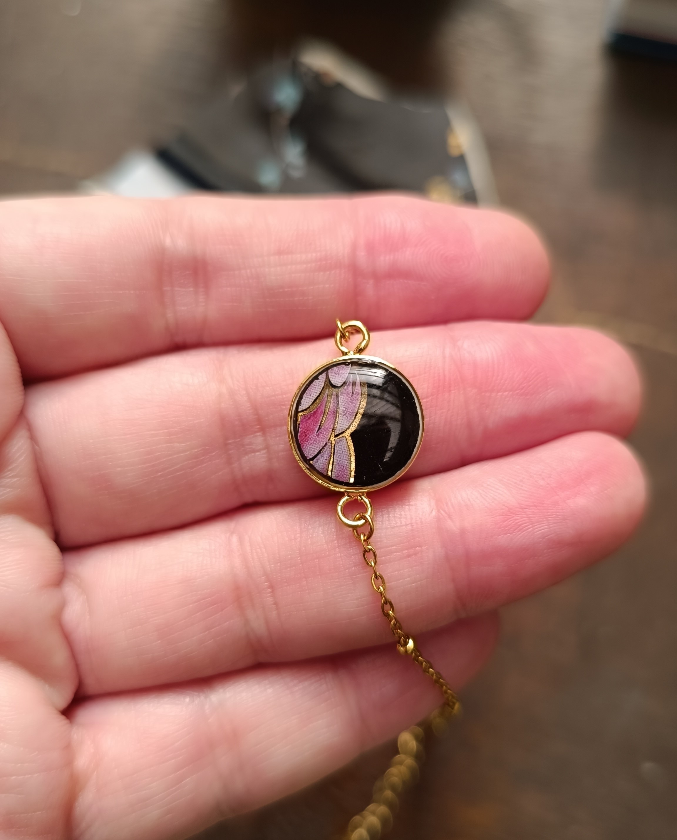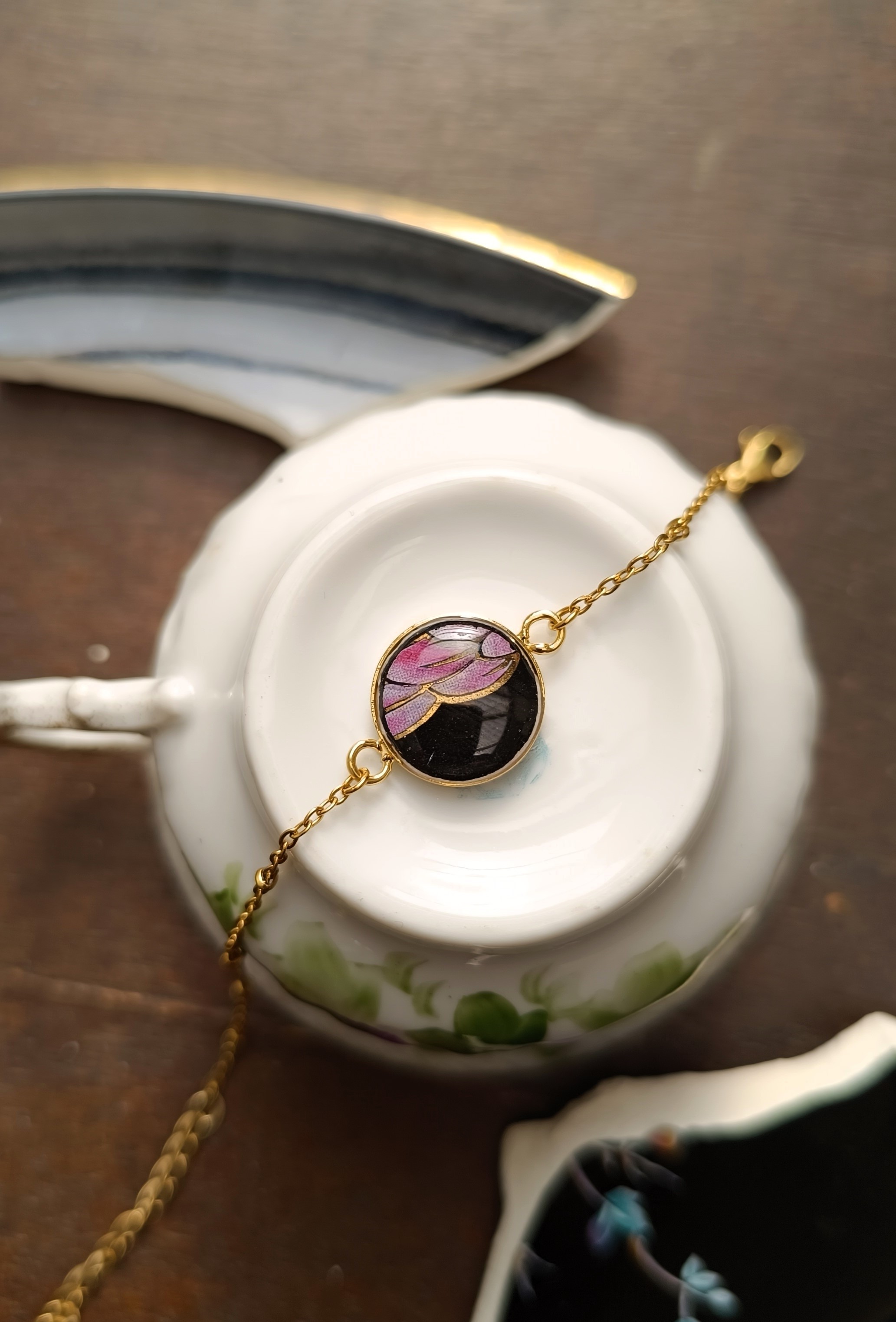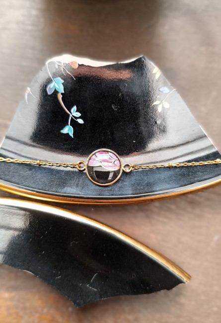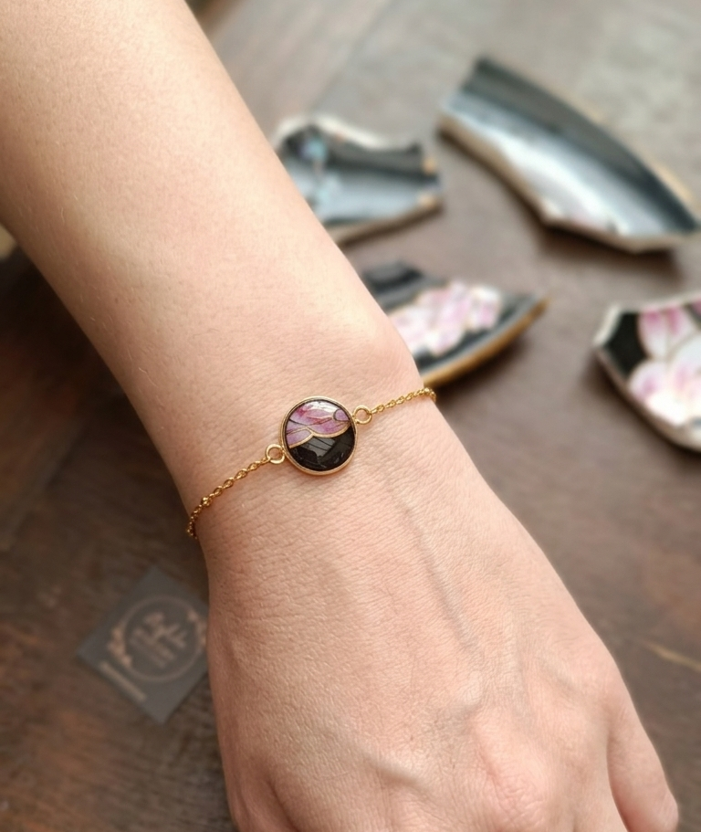 Ce bracelet est issu de la transformation d’une assiette ancienne en faïence asiatique, sélectionnée pour la subtilité de ses motifs et la richesse de ses teintes.