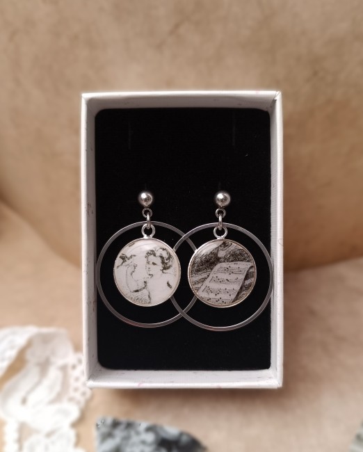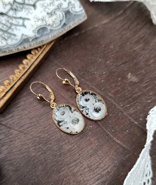 Ces boucles d’oreilles Relique sont nées de la transformation d’une assiette ancienne de la Faïencerie de Grigny, datée entre 1840 et 1870, modèle Jeux d’enfants, illustrant le mois de Février. Le motif met en valeur des roses noires et blanches, subtilement accompagnées d’une perle toupie noire recyclée, ajoutant raffinement et singularité.