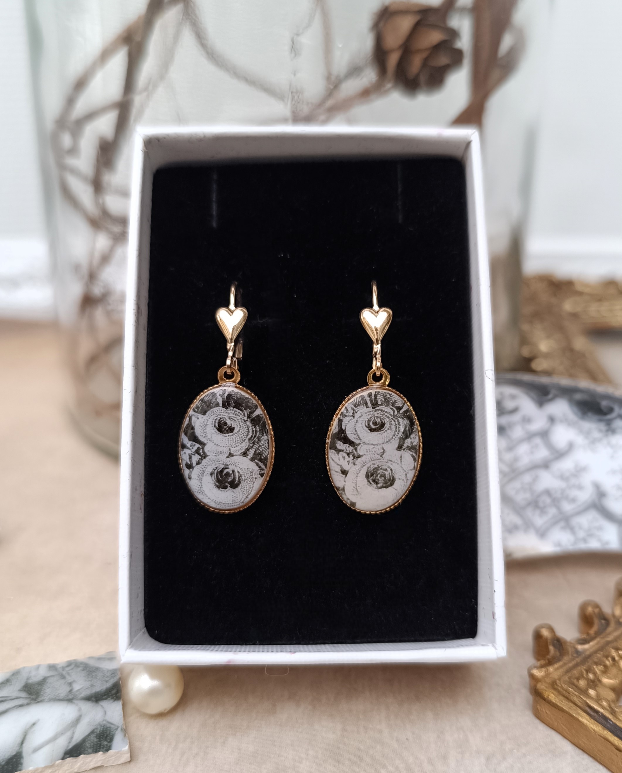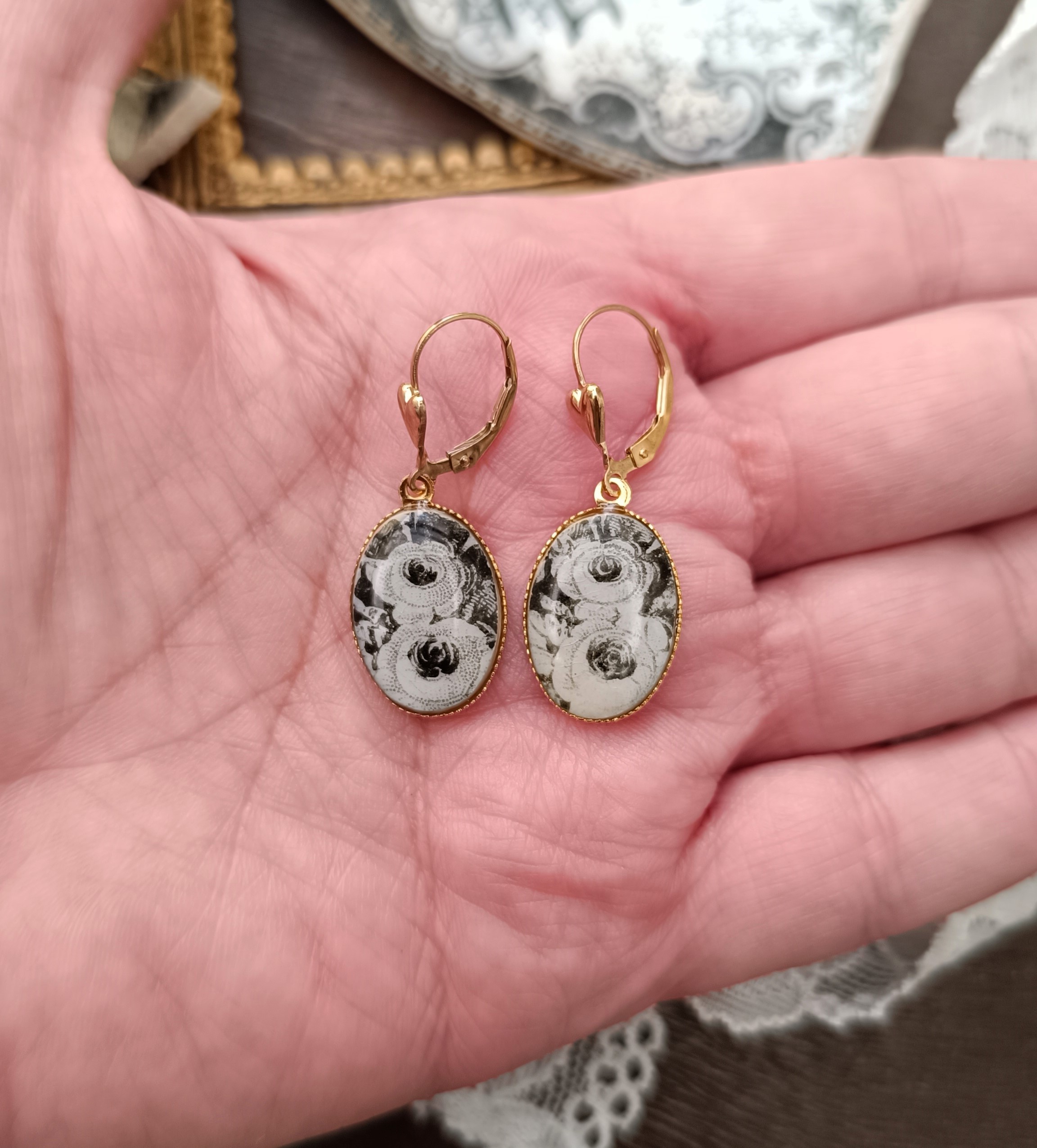 Ces boucles d’oreilles Relique sont nées de la transformation d’une assiette de la Faïencerie de Grigny datant du XIXe siècle, modèle Jeux d’enfants, illustrant le mois de Février. Le motif de roses noires et blanches a été soigneusement sélectionné pour sa finesse et son élégance intemporelle.
