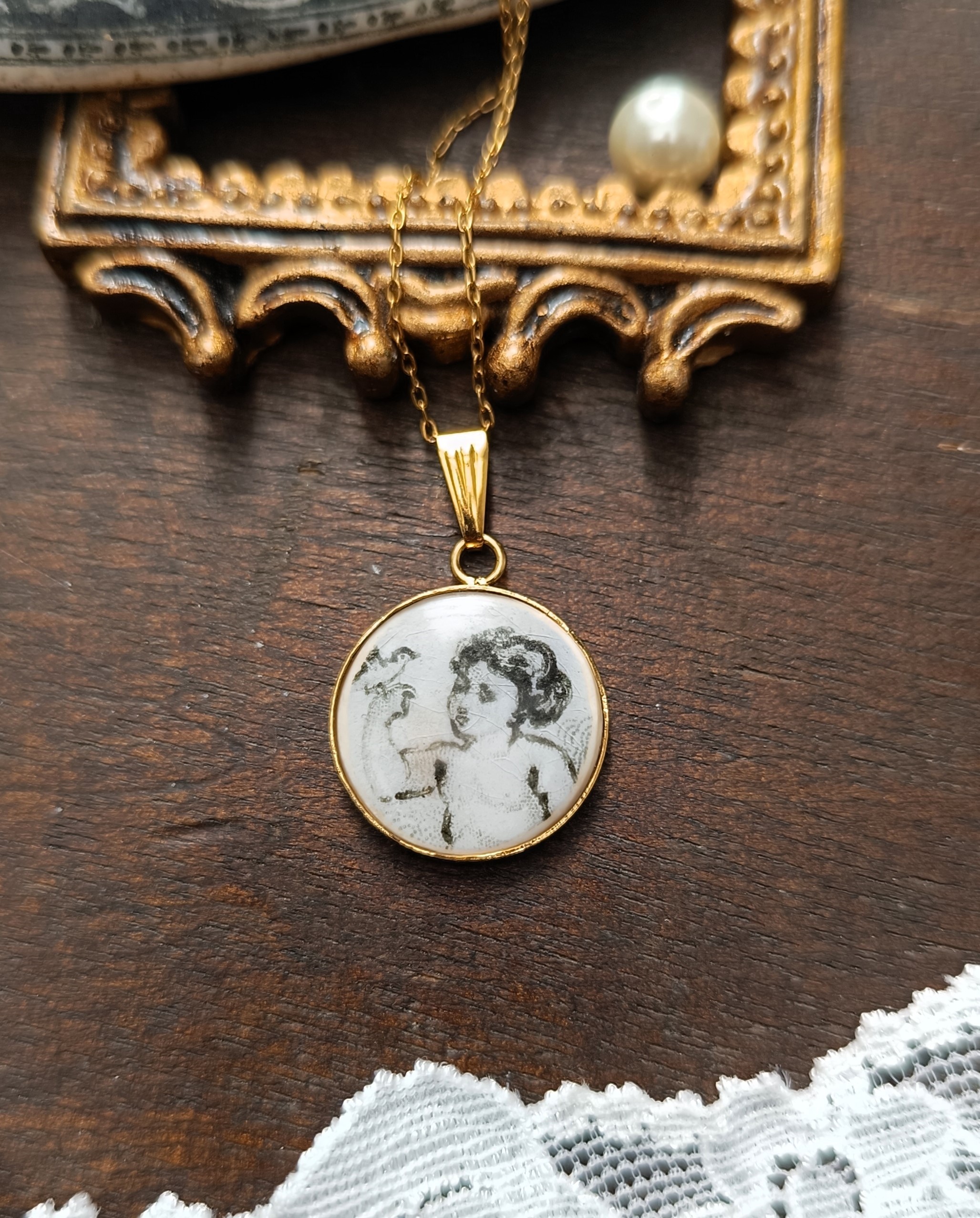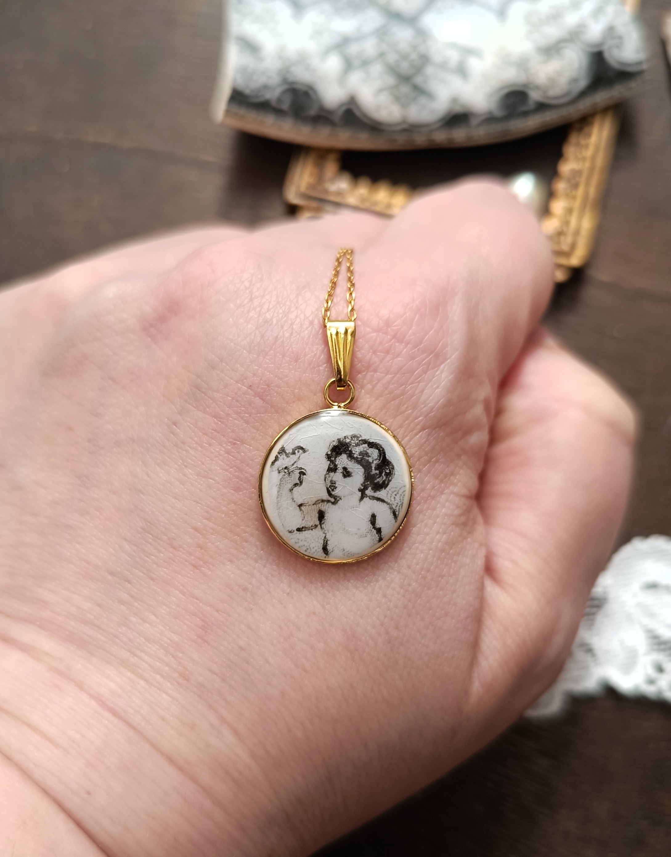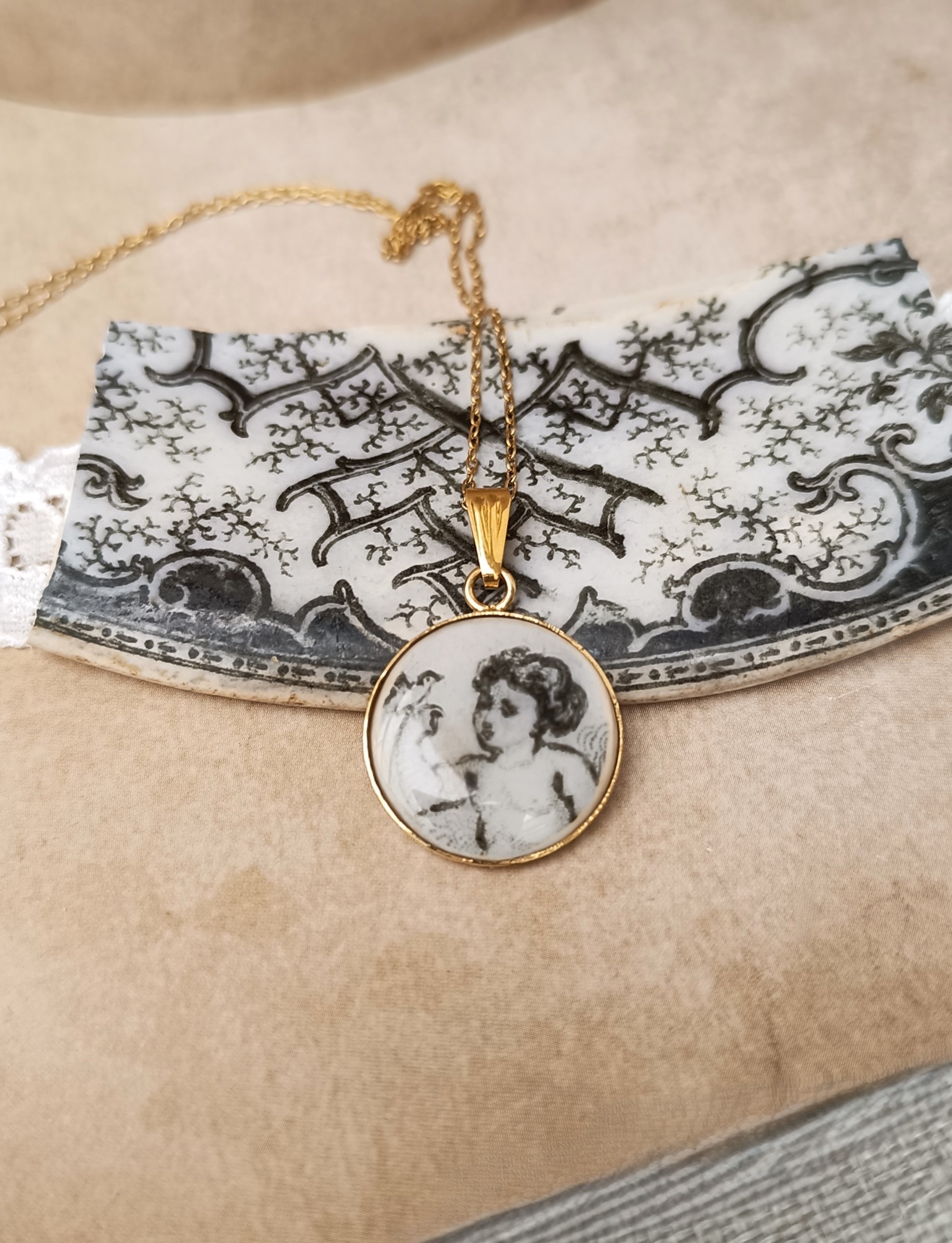 Le pendentif met en lumière un angelot tenant un oiseau posé sur son doigt, une scène pleine de douceur et de poésie, capturée dans un fragment de faïence ancienne.