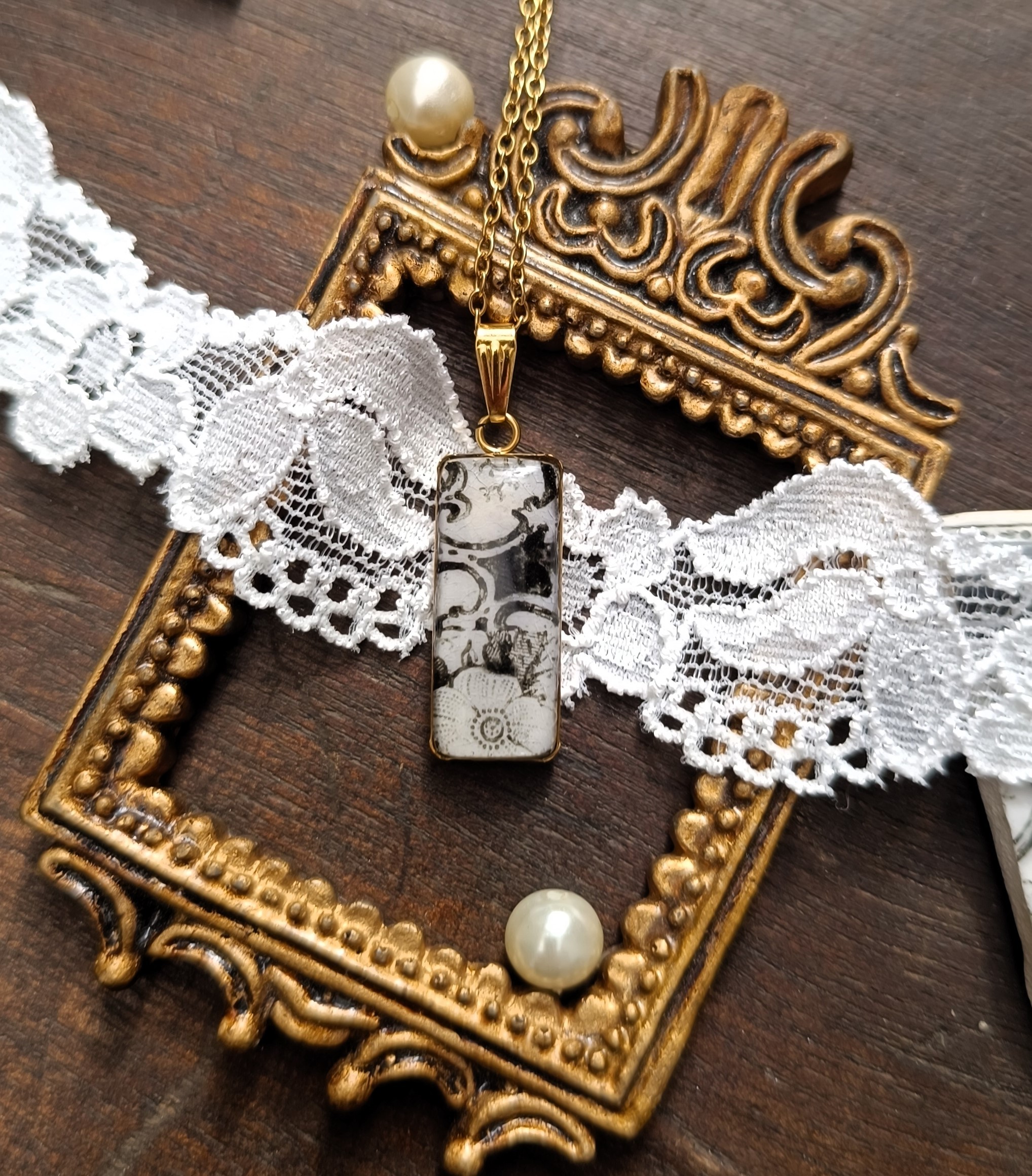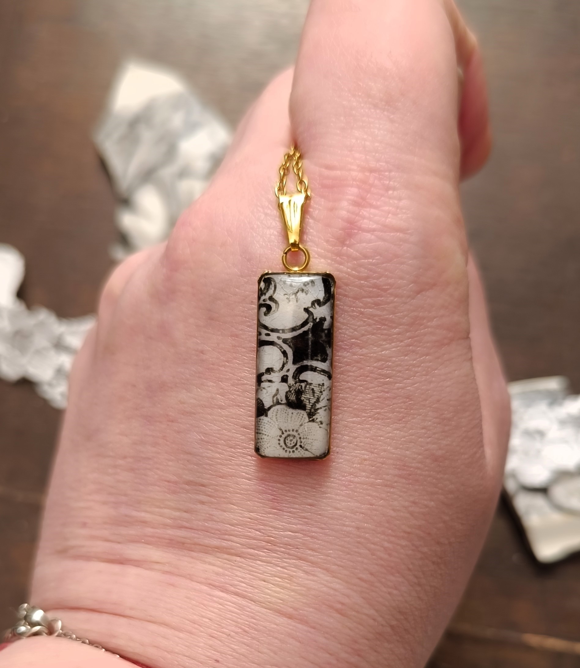 Le pendentif révèle un motif d’arabesques rococo noir et blanc, ponctué d’une petite fleur finement dessinée. Un décor subtil, presque comme un fragment de dentelle ancienne figé dans la matière.