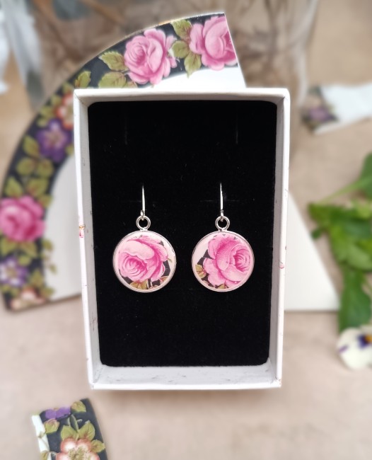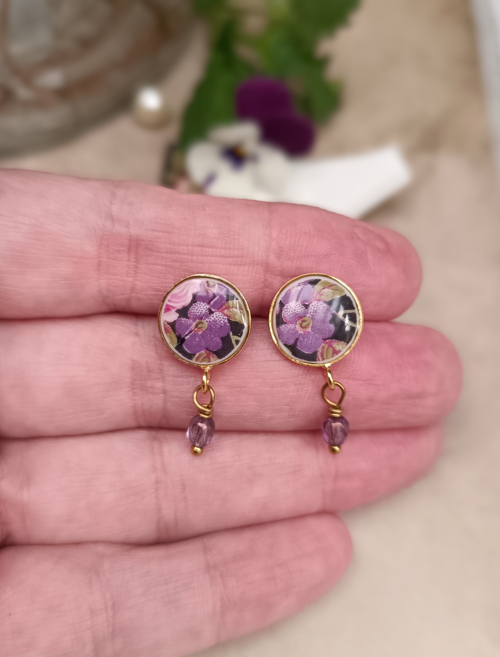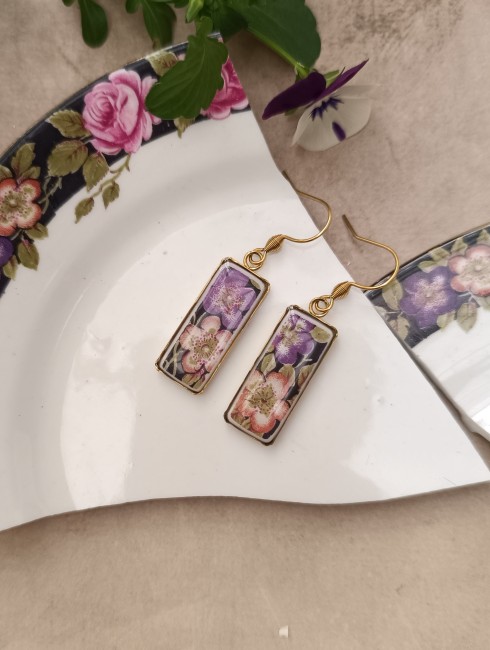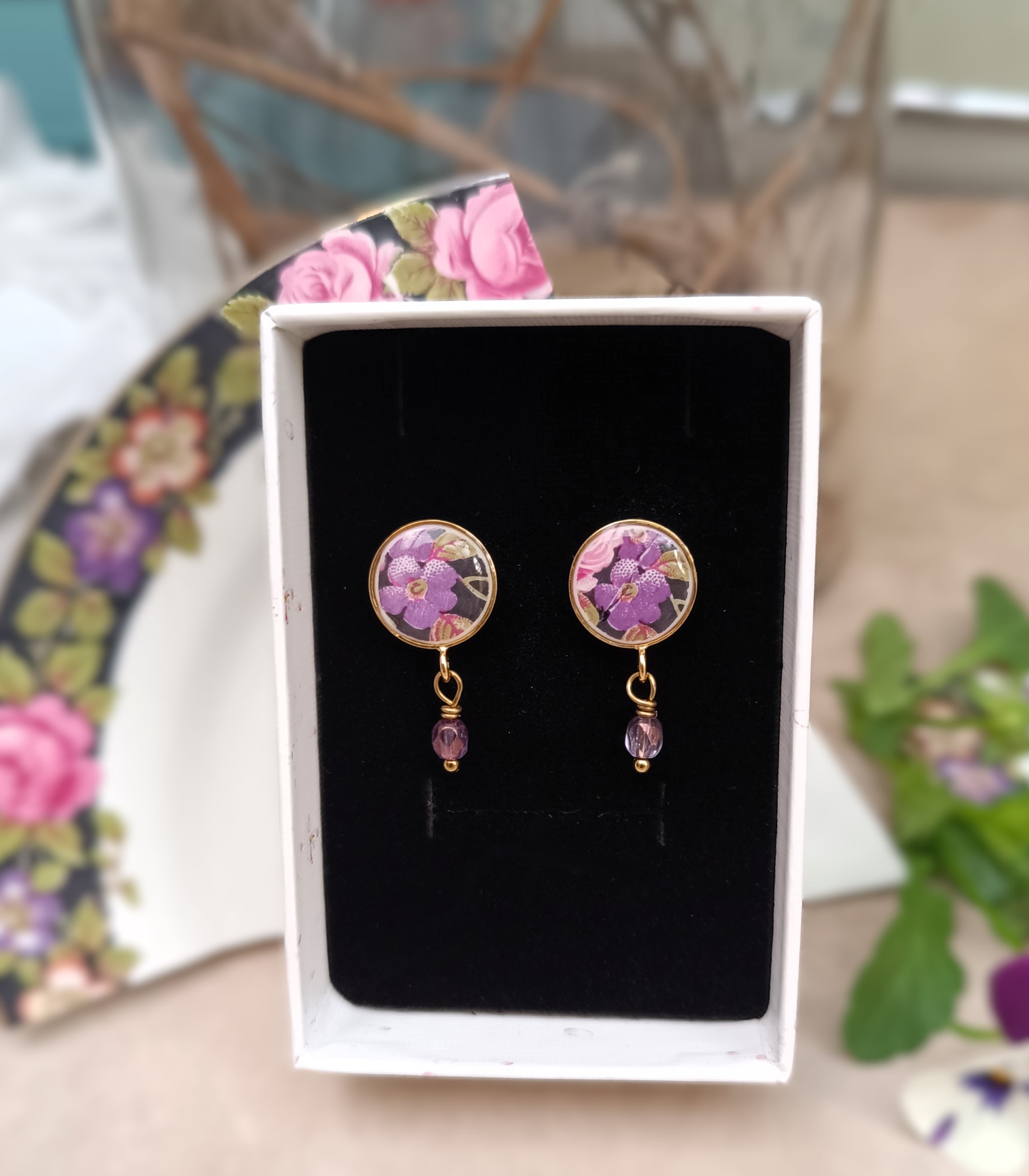 Ces puces d’oreilles sont nées de la transformation de sous-tasses dépareillées en porcelaine anglaise, soigneusement sélectionnées pour la finesse de leurs motifs.