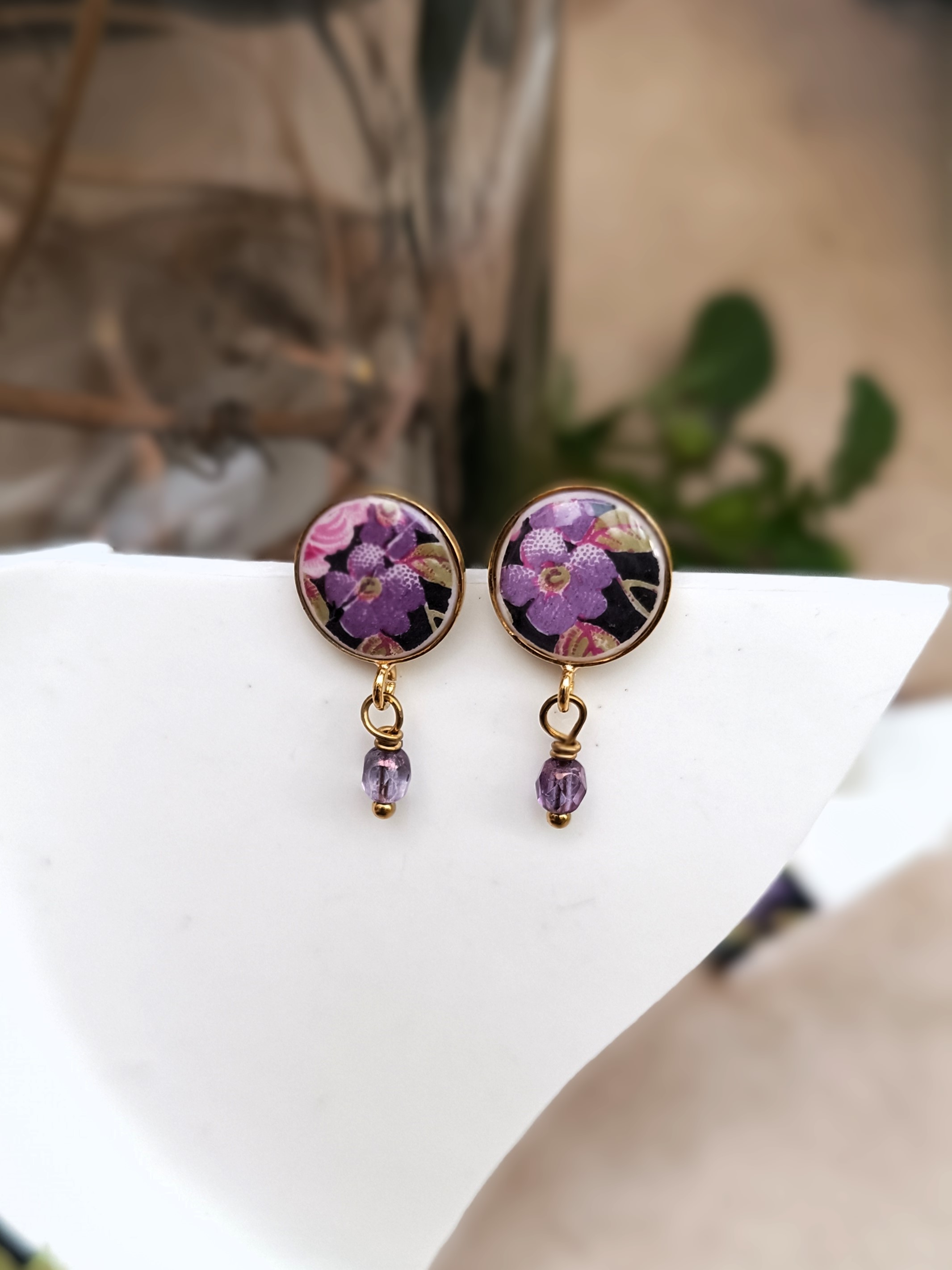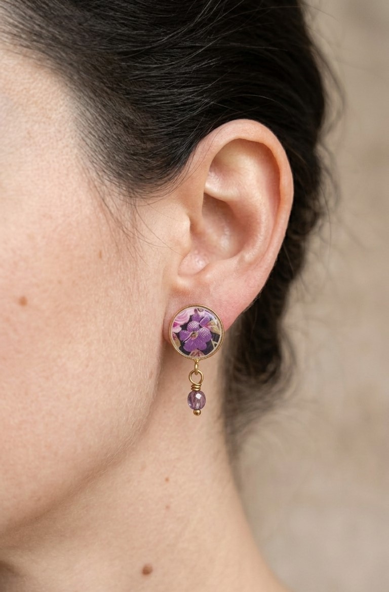 Une petite perle aux reflets violets irisés vient délicatement compléter la composition, apportant une touche lumineuse et poétique.