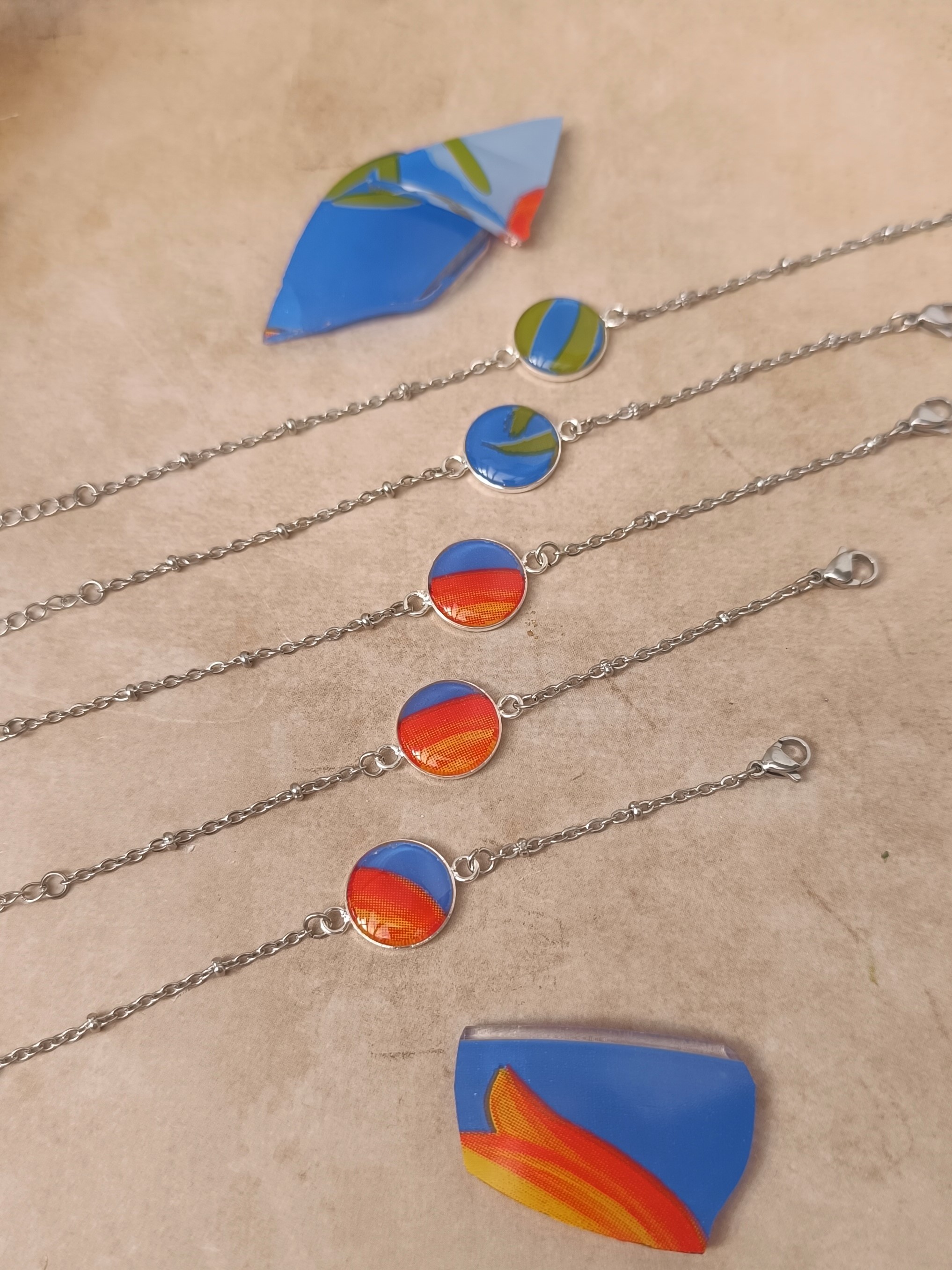 Ces cinq bracelets ont été réalisés à partir d’un bol en verre ayant appartenu à la famille de ma cliente.