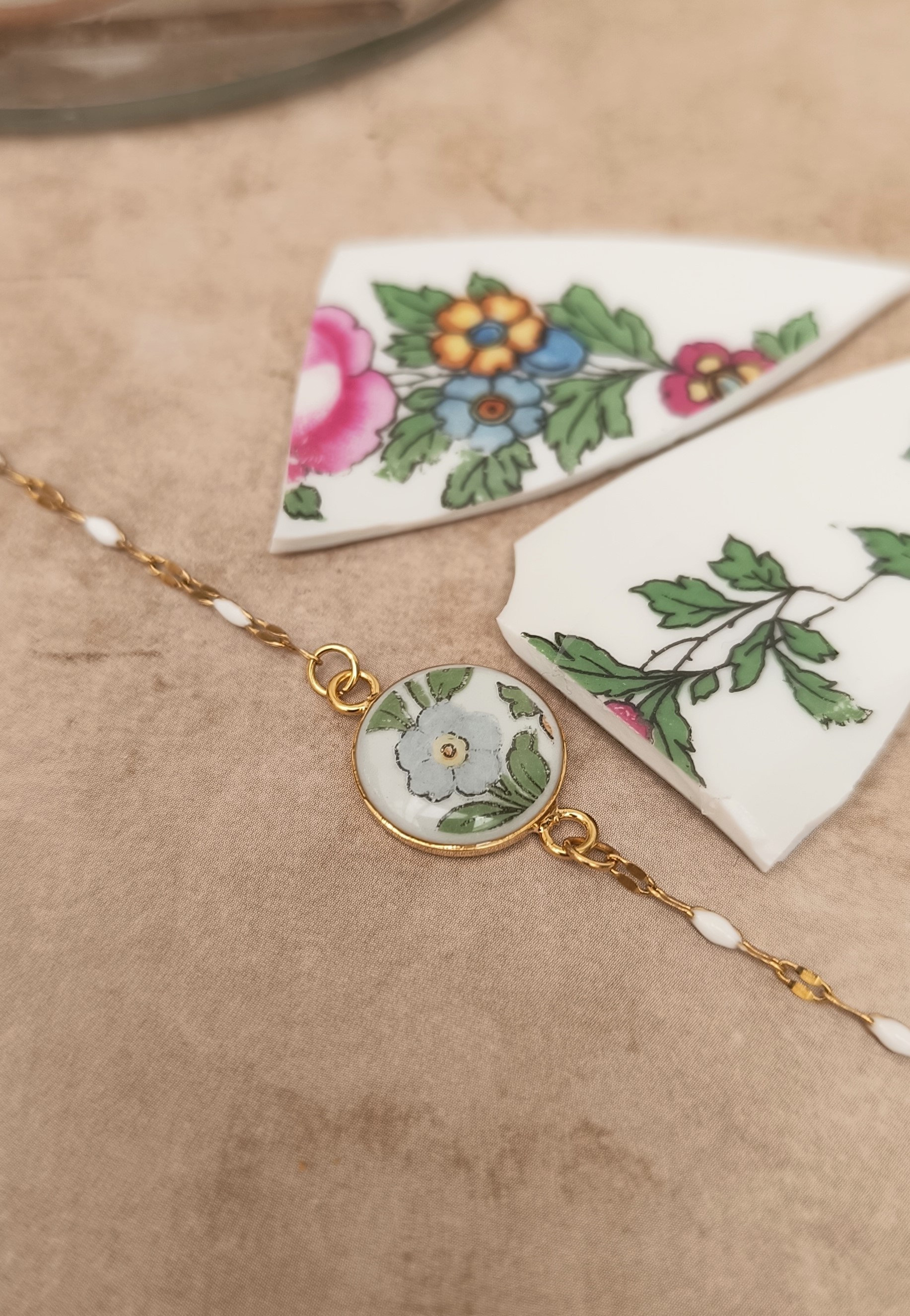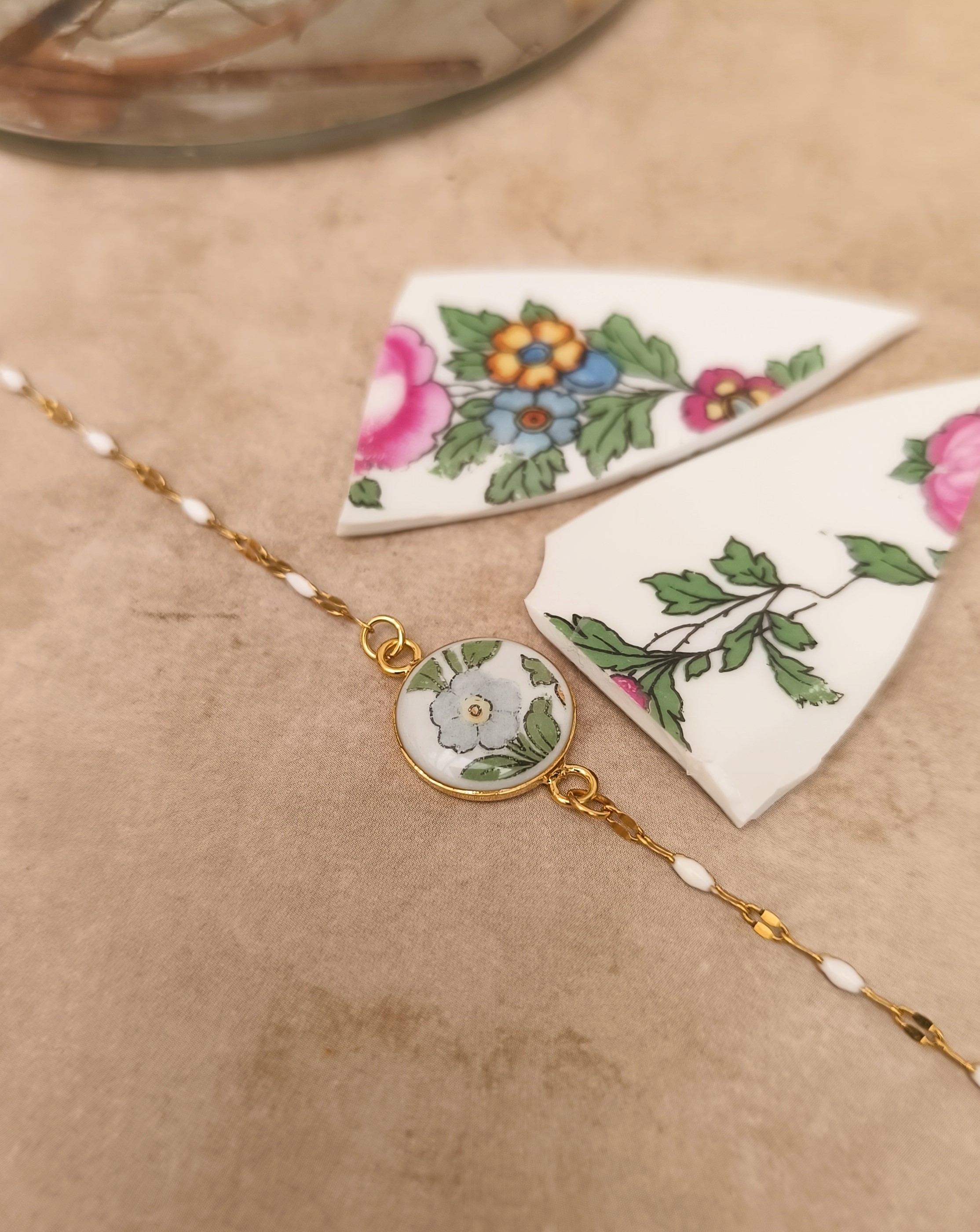 Ce bracelet a été créé à partir des fragments de l’assiette brisée lors des fiançailles de Marie, un geste fort chargé d’émotion et de promesse.