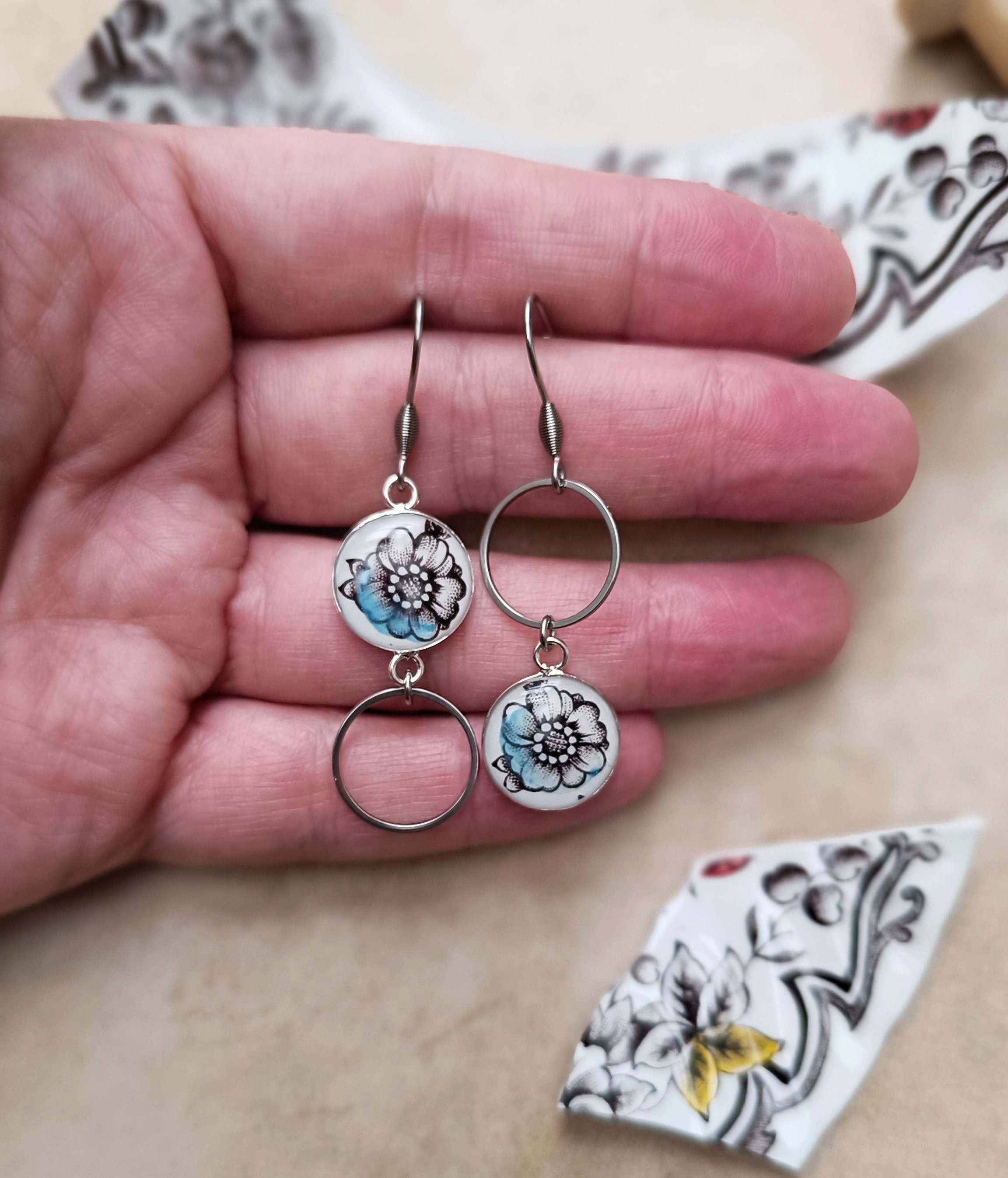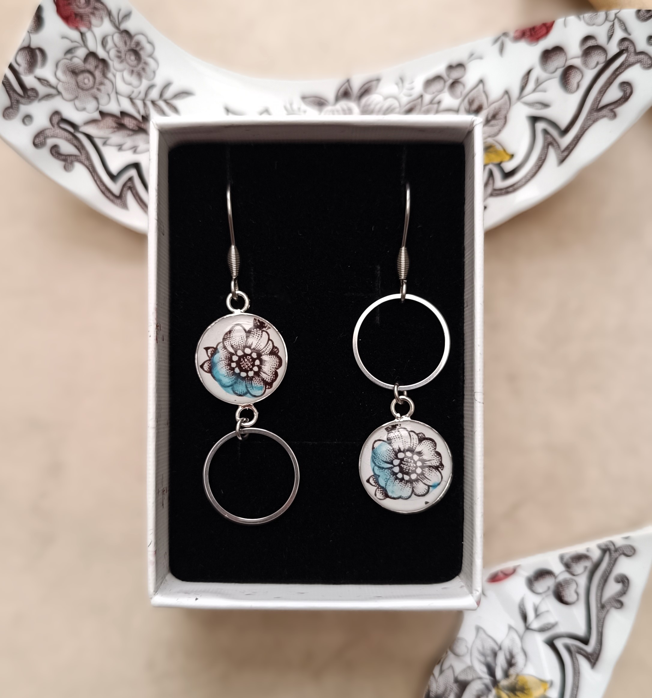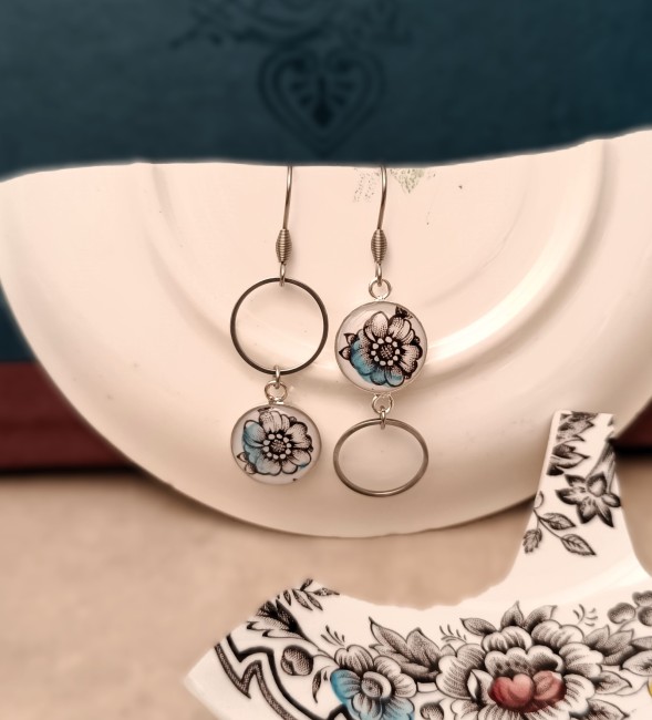 Ces boucles d’oreilles sont nées de la transformation d’un set de coupelles en porcelaine anglaise Ridgway, modèle Clifton, fabriqué à Staffordshire.