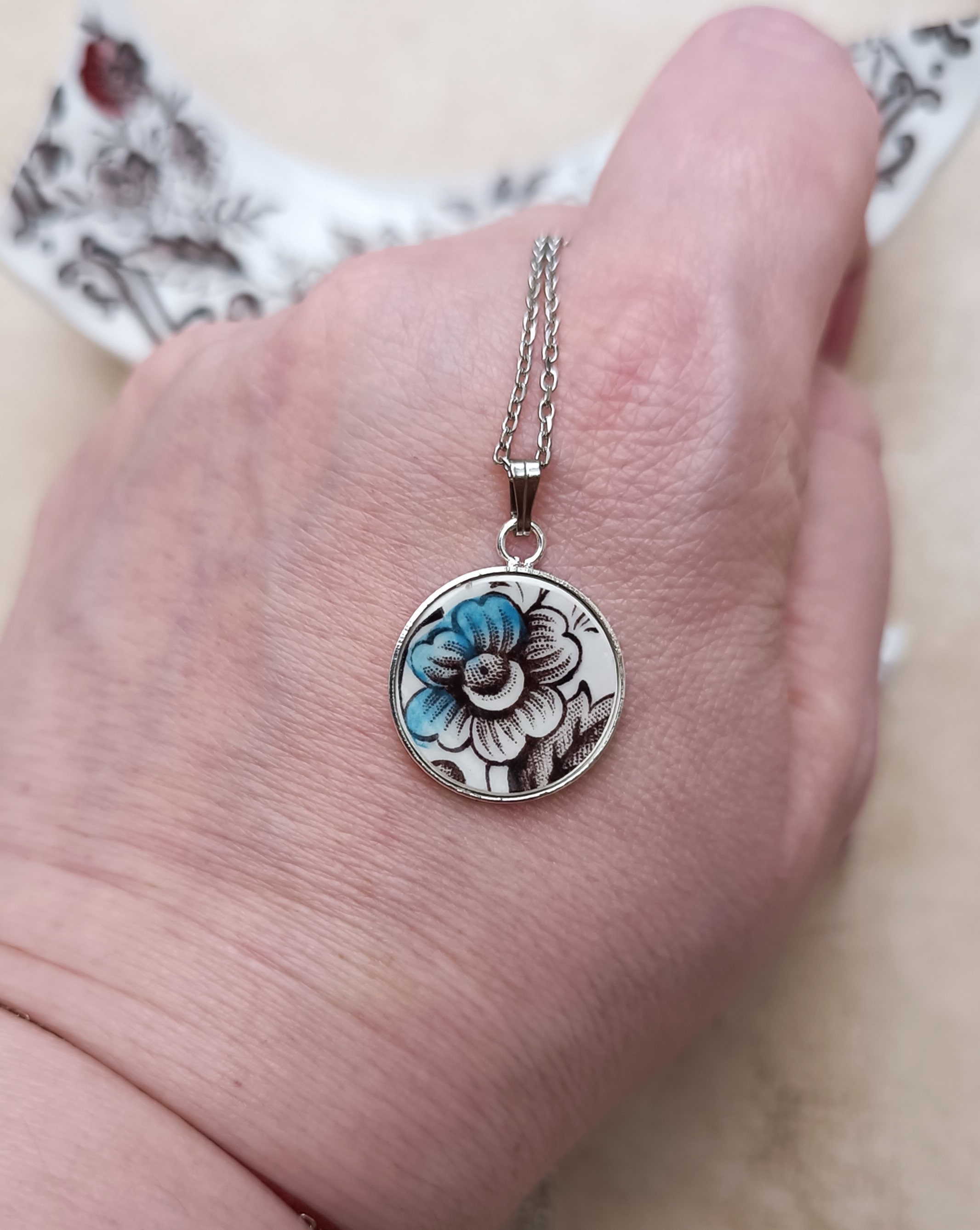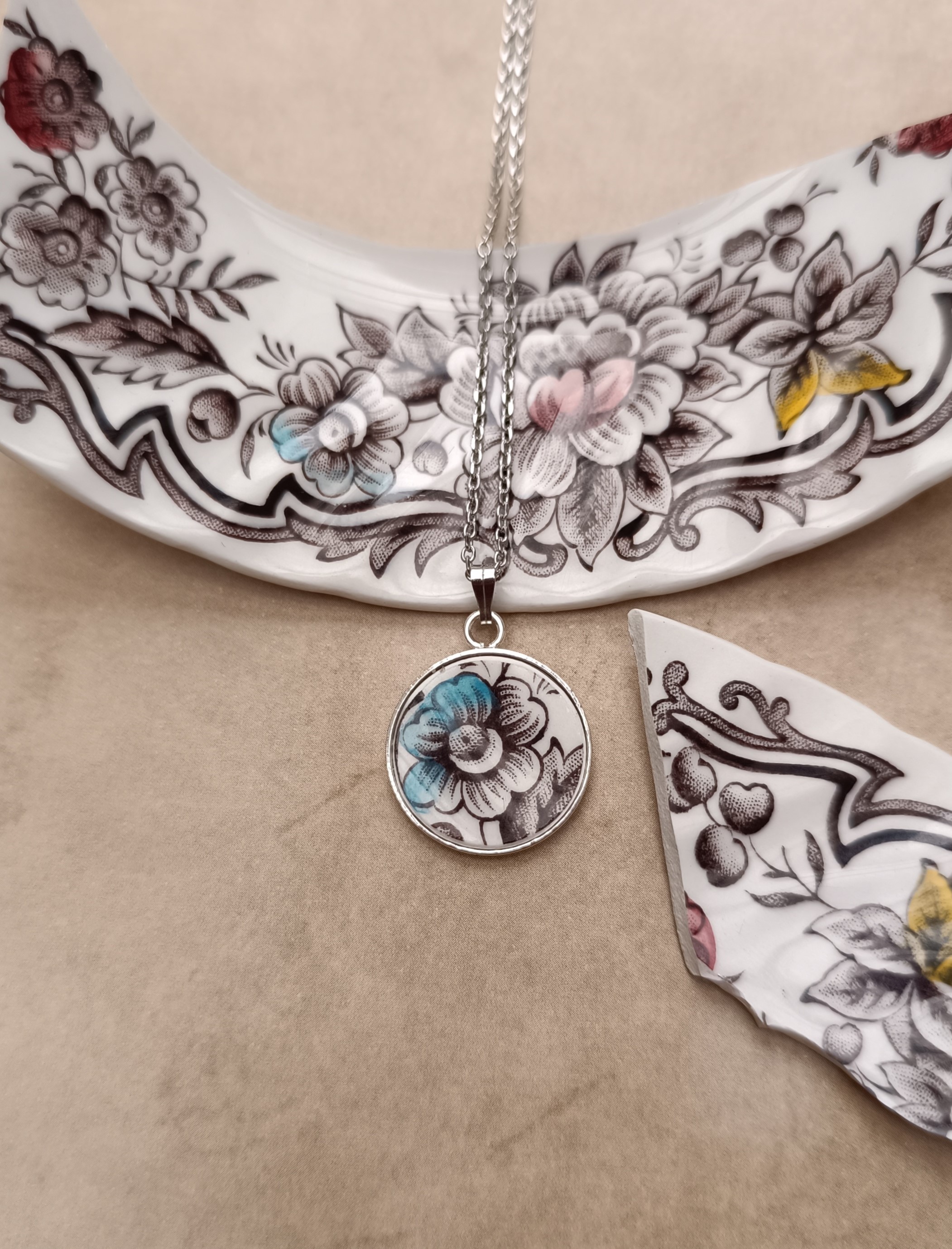 Chaque fragment de porcelaine a été découpé, façonné et poli à la main dans mon atelier afin de préserver toute la finesse du motif floral d’origine.