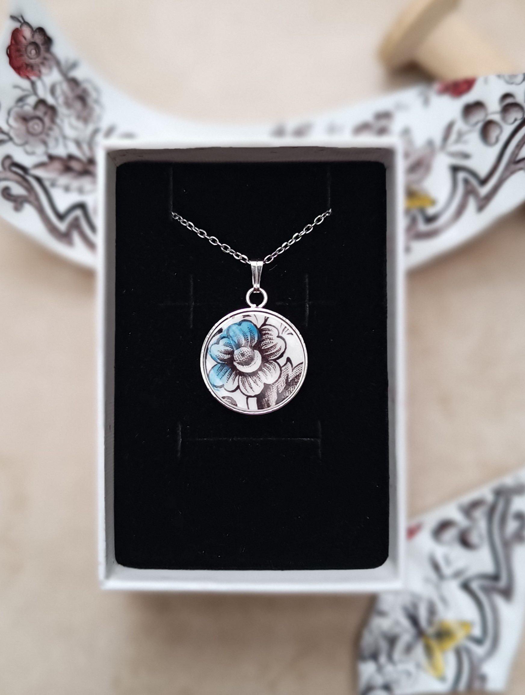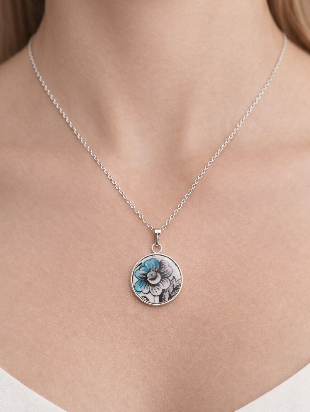 Le pendentif met en lumière une délicate fleur aux nuances brun doux et bleu turquoise, posée sur un fond blanc lumineux qui révèle toute la finesse du décor.