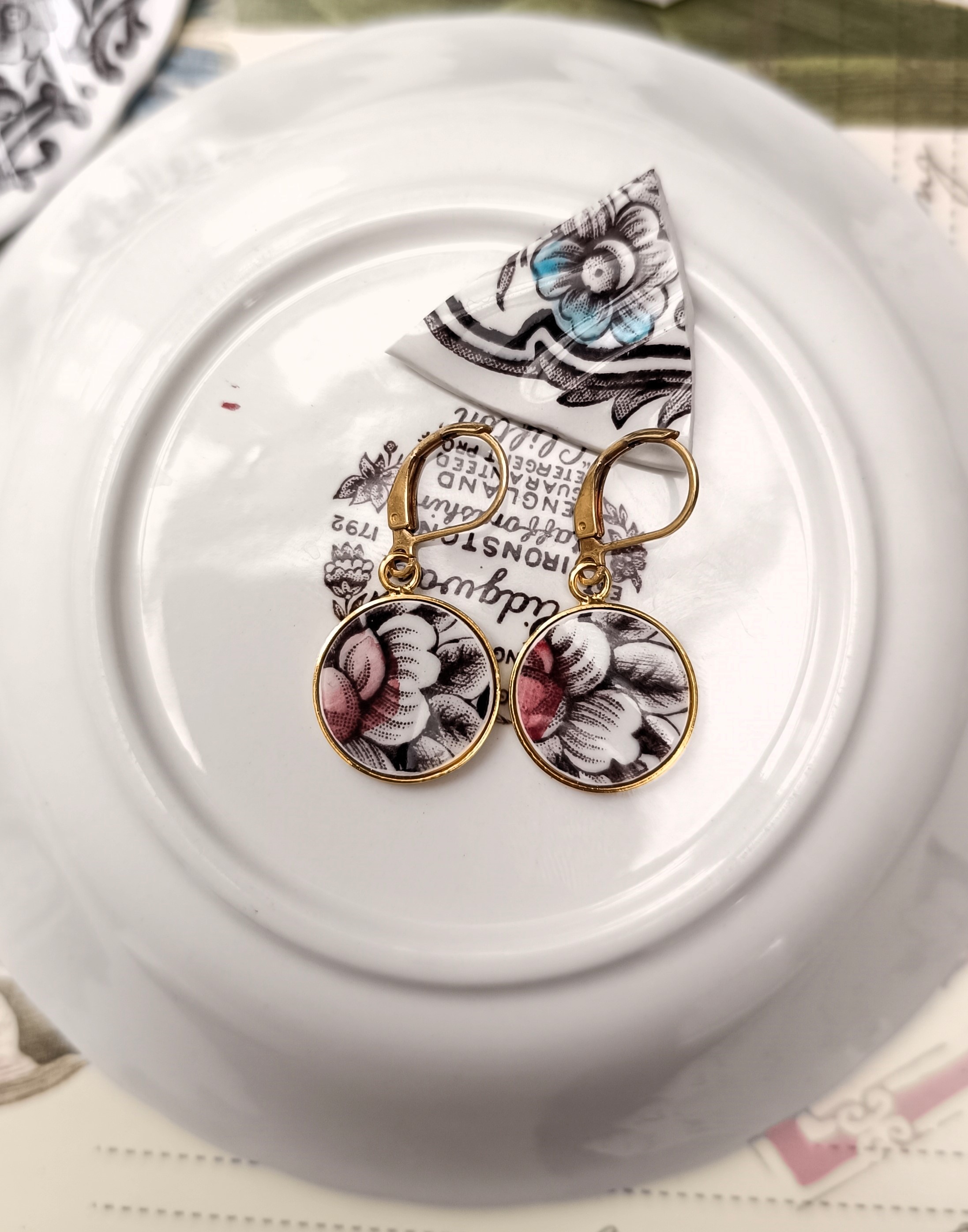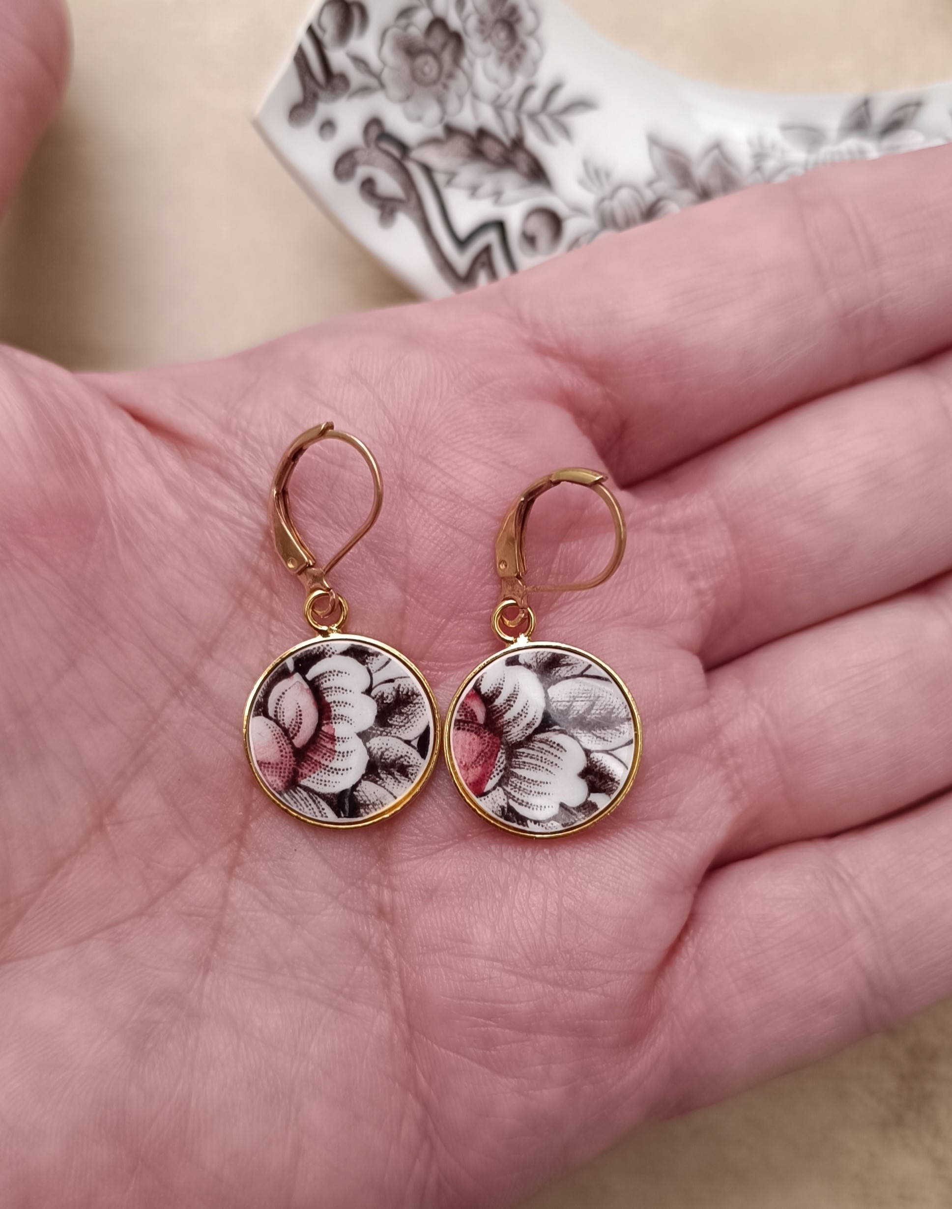 Ces boucles d’oreilles dormeuses sont issues de la transformation d’un set de coupelles en porcelaine anglaise Ridgway, modèle Clifton, fabriqué à Staffordshire.
