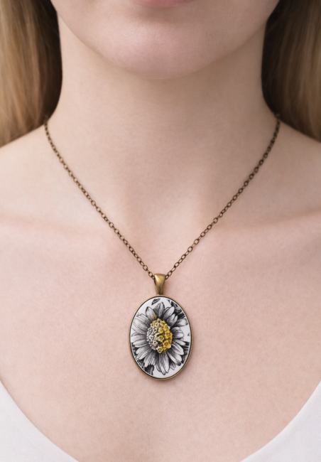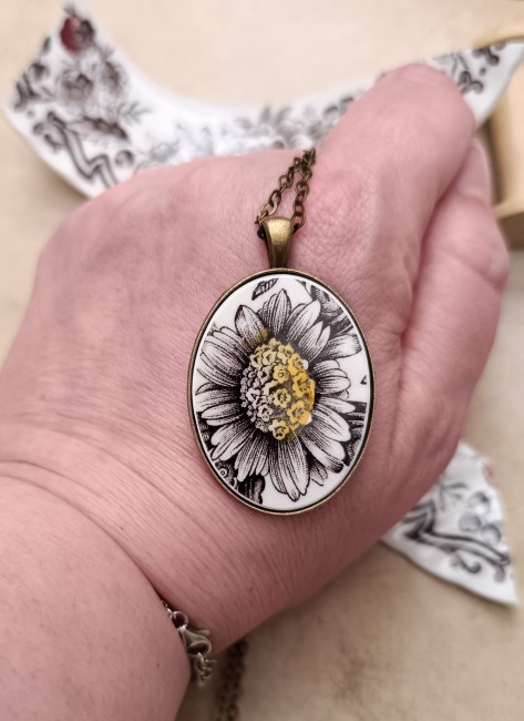 Le pendentif met en valeur une magnifique fleur esprit tournesol, dans des nuances brunes délicates sublimées par de lumineuses touches de jaune.