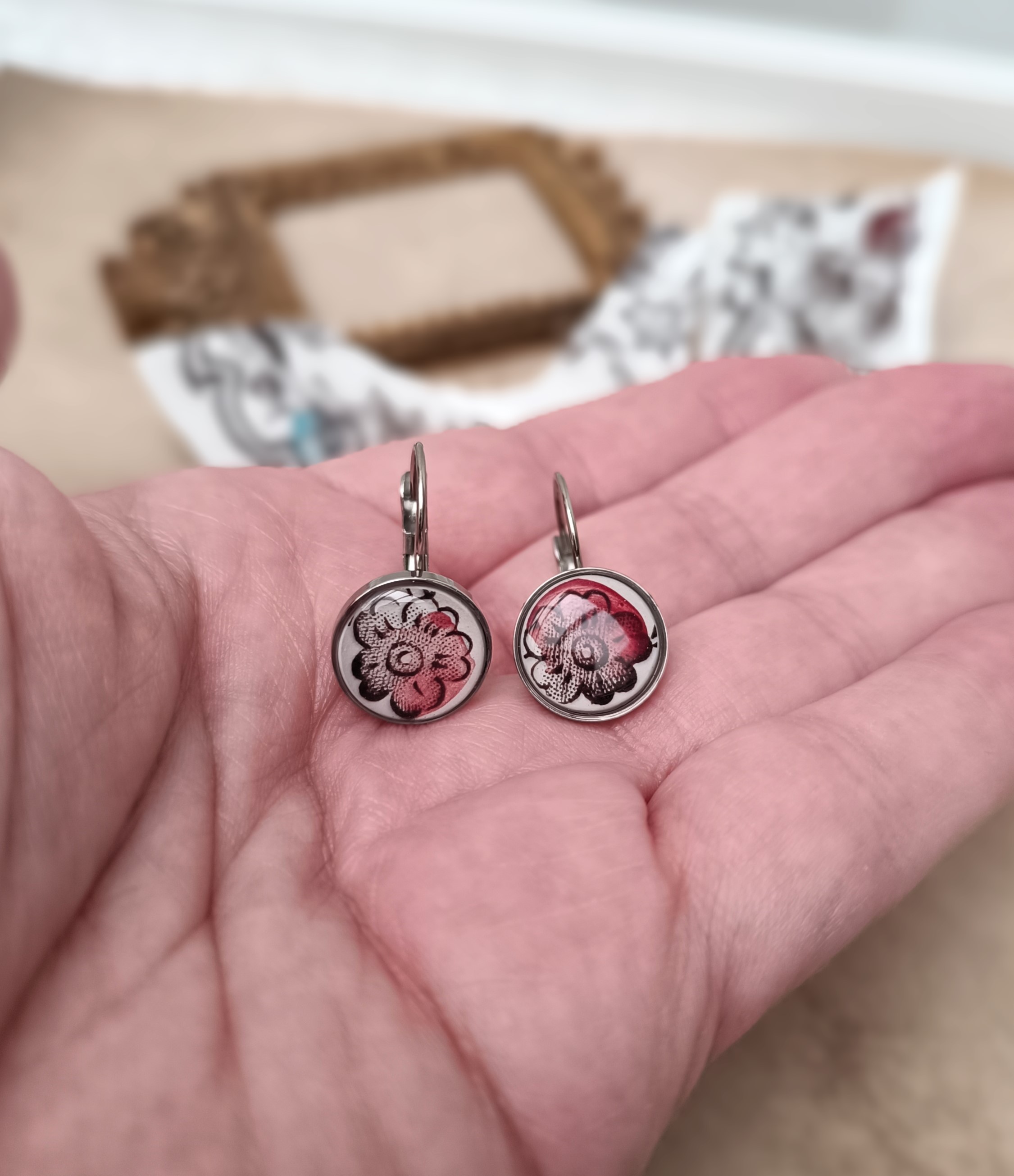 Boucles d’oreilles dormeuses Divine – Porcelaine anglaise fleurs brunes et bordeaux