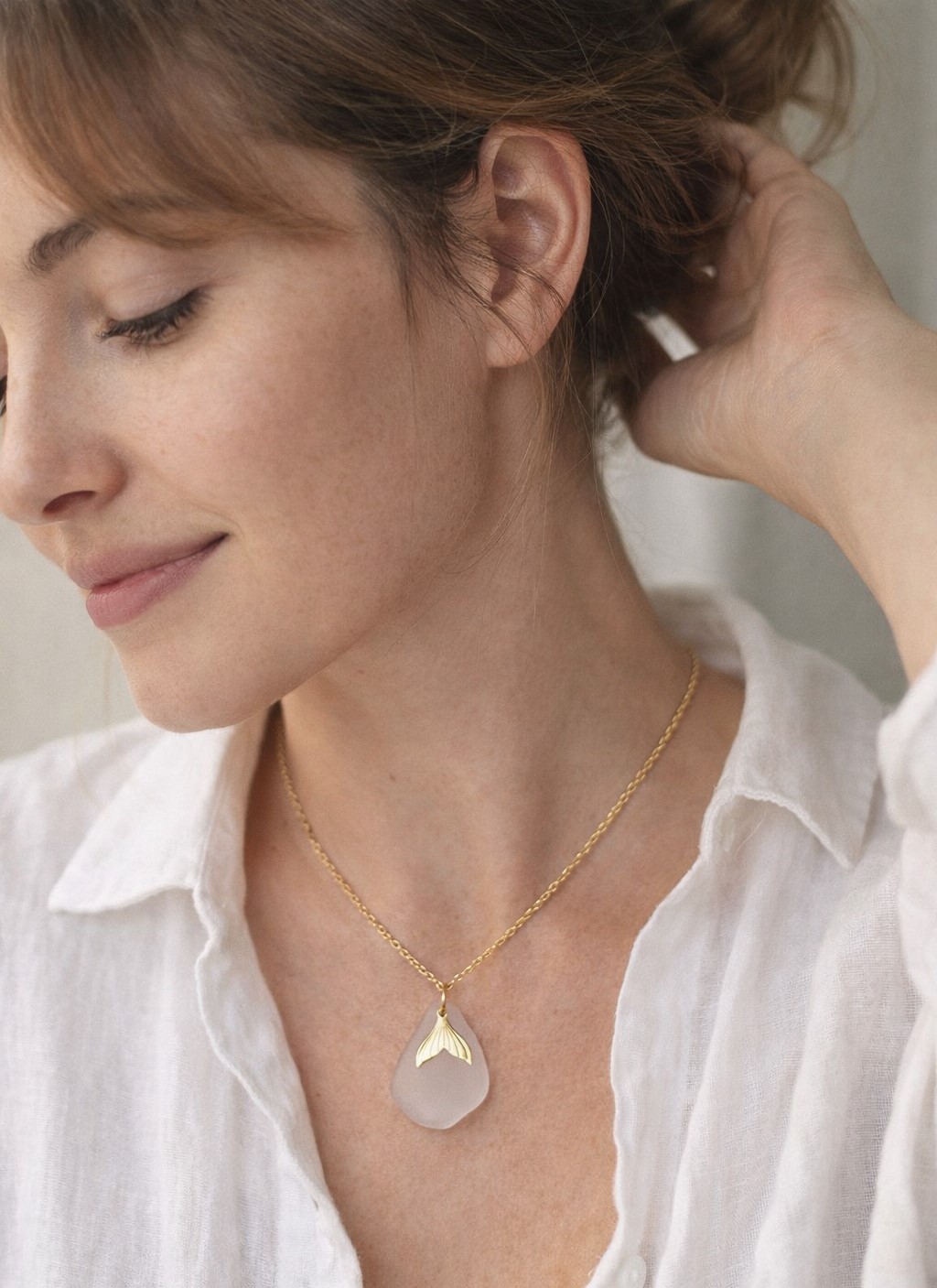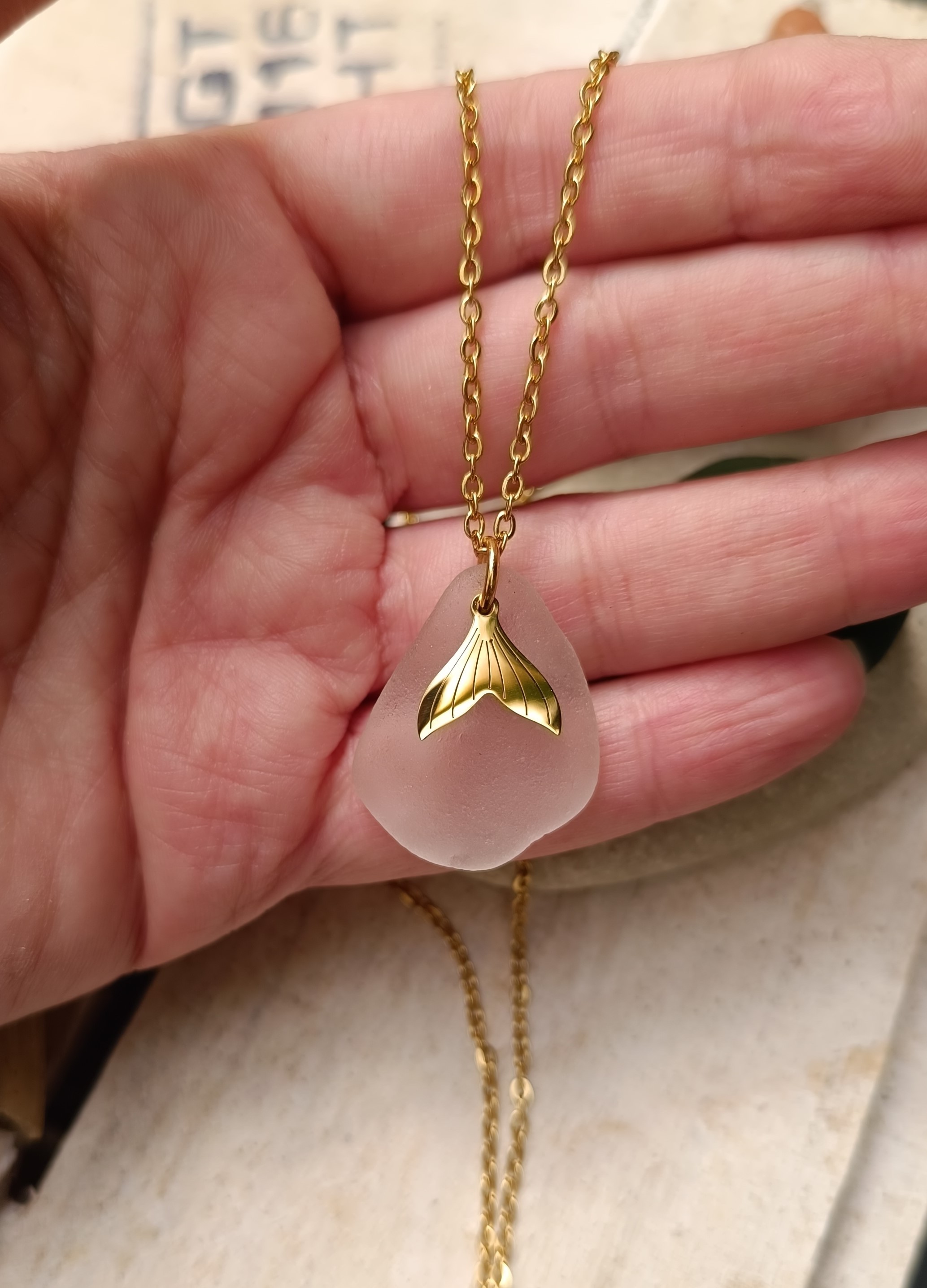 Collier Ondine – Verre de mer blanc au voile rosé